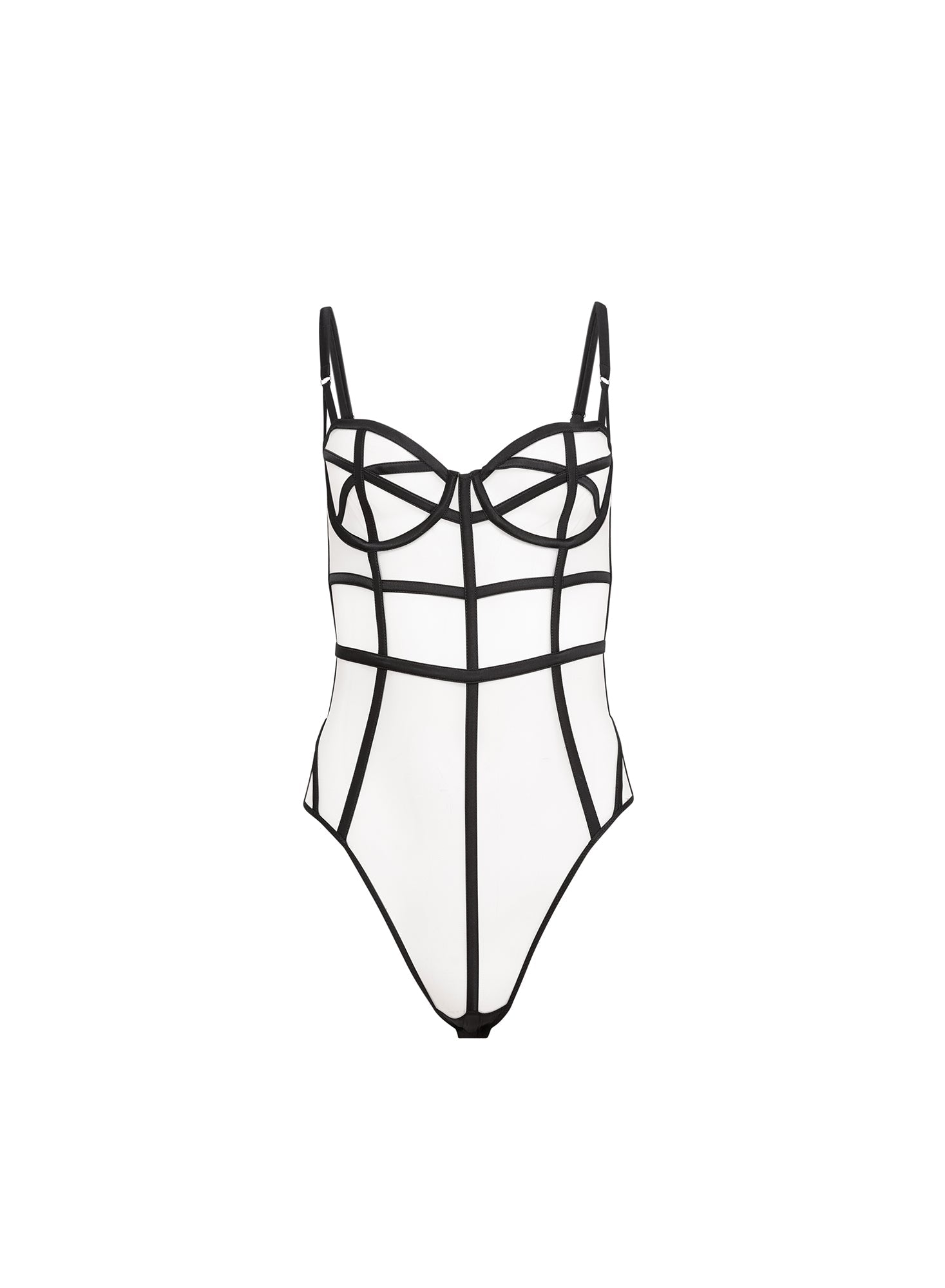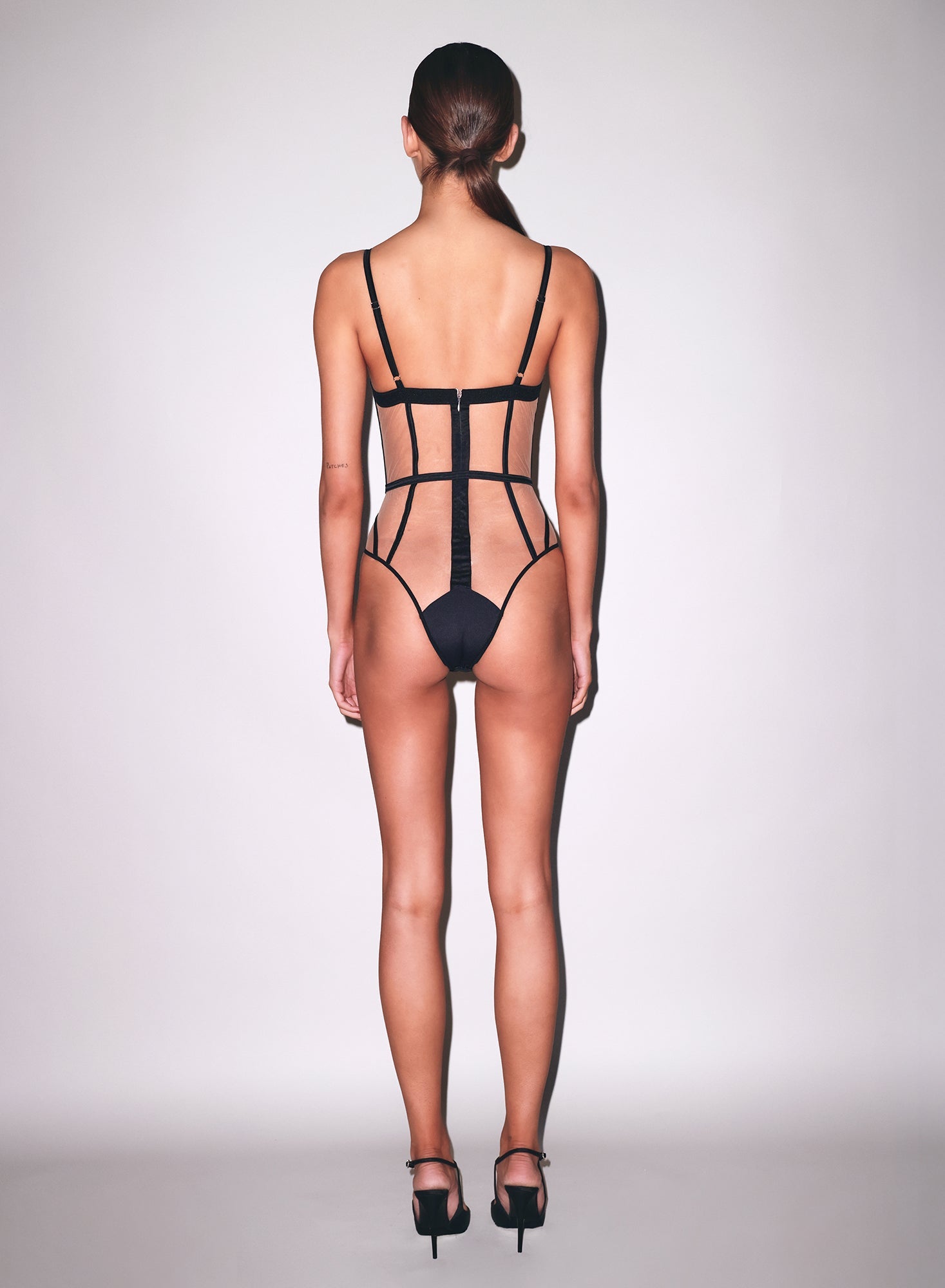 Our Caged Bodysuit features silk straps sewn onto illusion tulle ground with underwire cups and adjustable silk straps, complete with a back zip closure. Amp up the sex appeal with the Opaque Stay Up Stocking for a cohesive, head-turning look.
