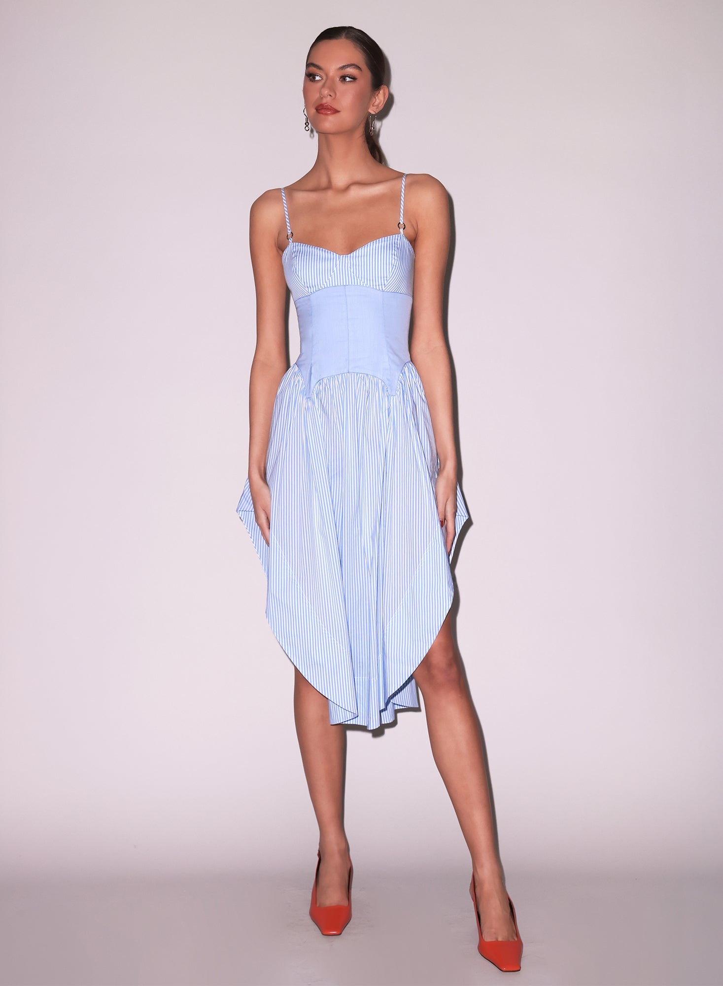 Our lightweight cotton poplin dress features delicate corset-inspired underbust and garter seaming details, adjustable straps for a custom fit, and a flirty full-volume skirt with a subtly higher side hem for a playful, flattering silhouette. Layer it over matching lace for a coordinated look.