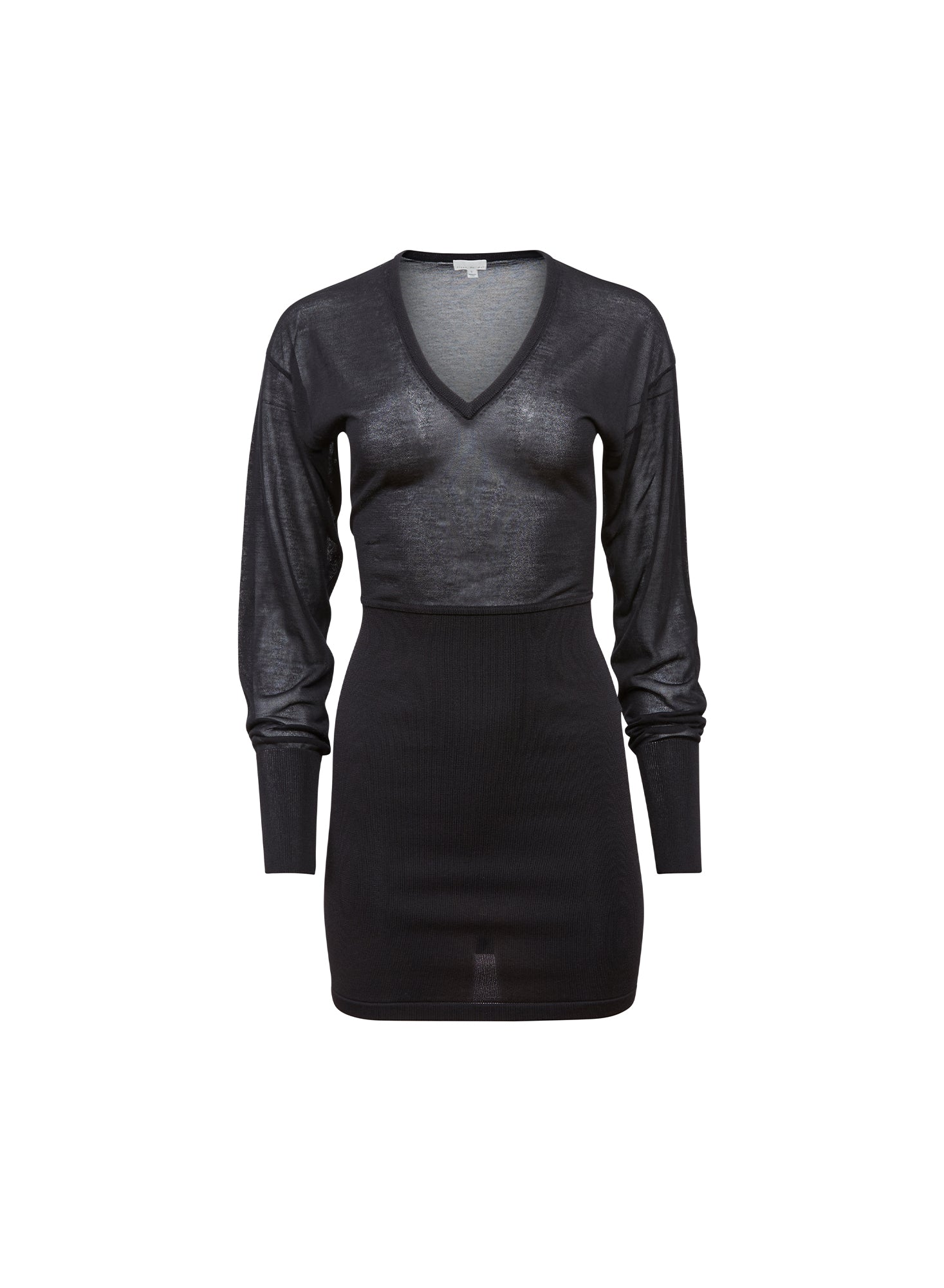 The flattering V-neckline and semi-sheer knit top create a beautiful silhouette, while the long sleeves and solid knit skirt offer a balanced, modern look. Layer it over delicate lingerie for an added dimension of style.