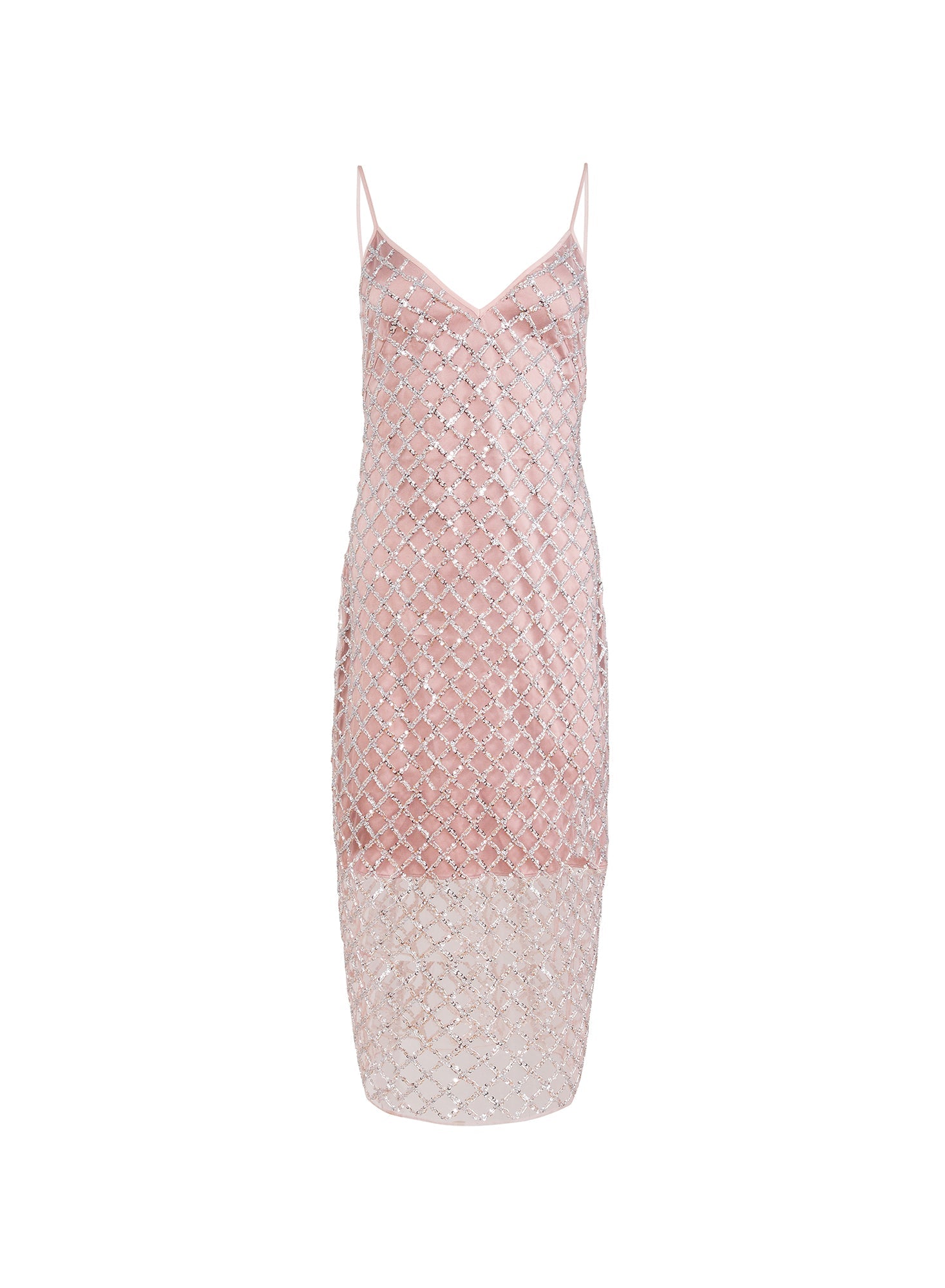 Featuring a delicate sheer tulle adorned with a diamond grid of silver sequins and a luxe silk lining for a flawless, comfortable feel. The invisible side zip and adjustable straps ensure a perfect, personalized fit.