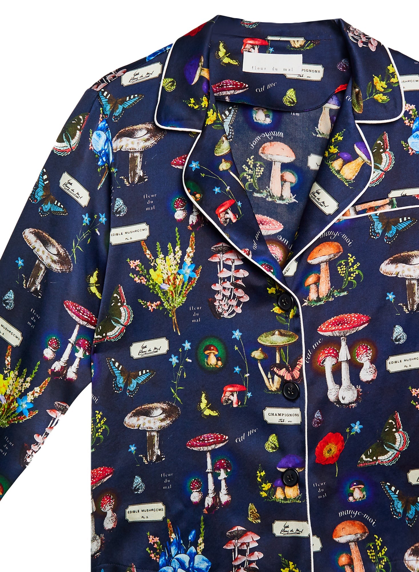Groovy and decadent silk satin pajama top in a magical mushroom print. Features front buttons, contrasting white trim, and a pocket detail. Pair with matching pants for a chic set that works perfectly on the streets or in the sheets.
