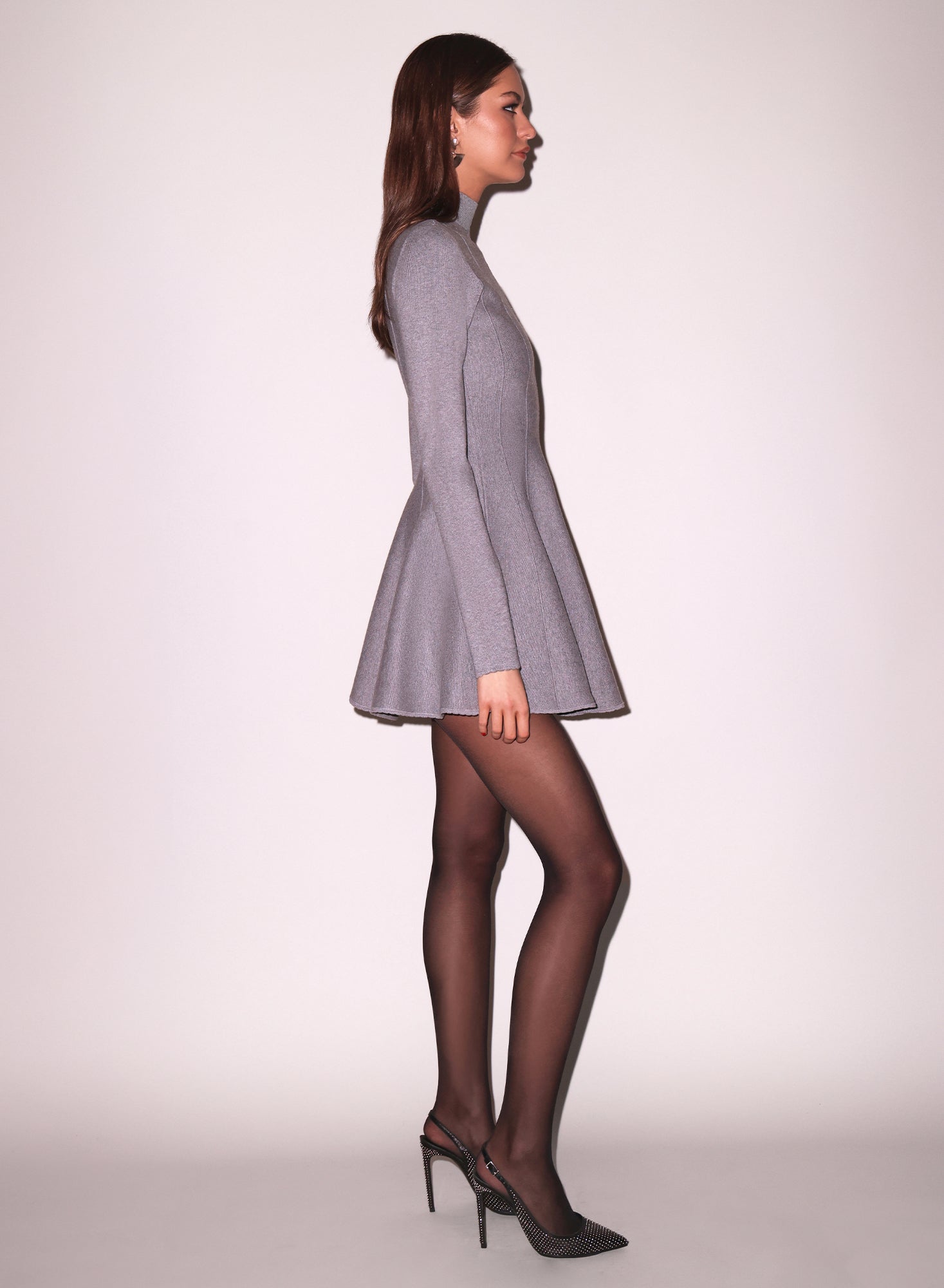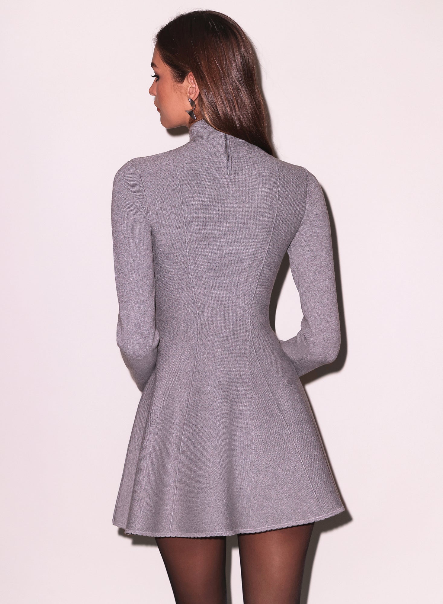 This dress features soft structured jacquard knit with corset seaming to beautifully define your waist, a mock neck, and a playful flared skirt for a fitted, mini-length silhouette.