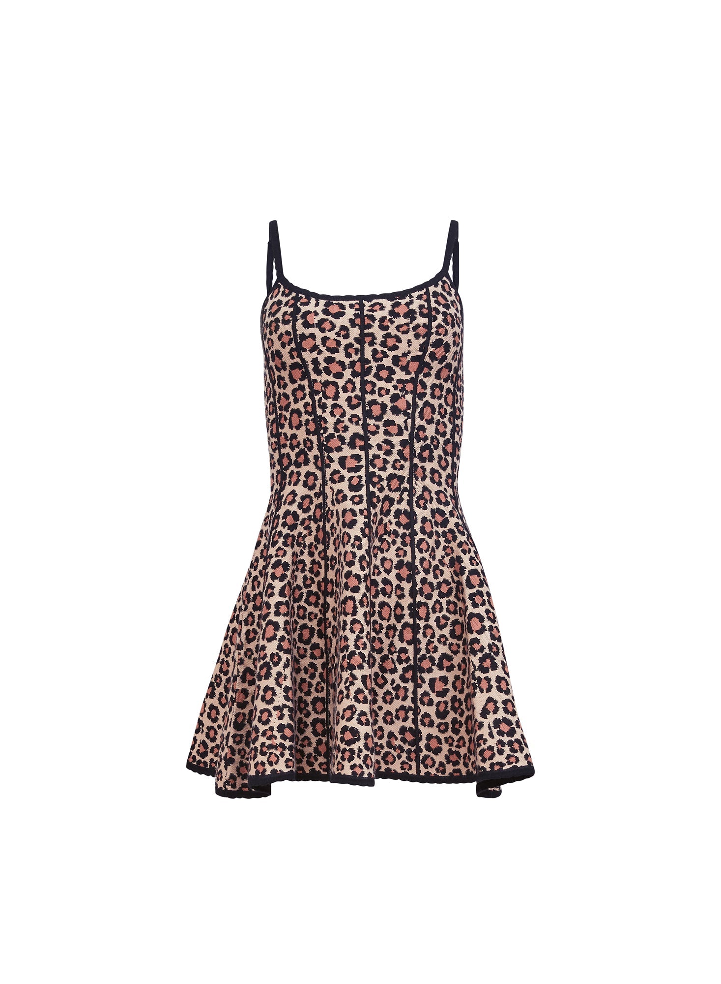 Features a low-cut square neckline and adjustable straps with scalloped detail, crafted from soft structured jacquard knit with corset seaming to beautifully define your waist. The playful flare skirt and exposed back zipper add a touch of modern charm to this fitted, mini-length silhouette.