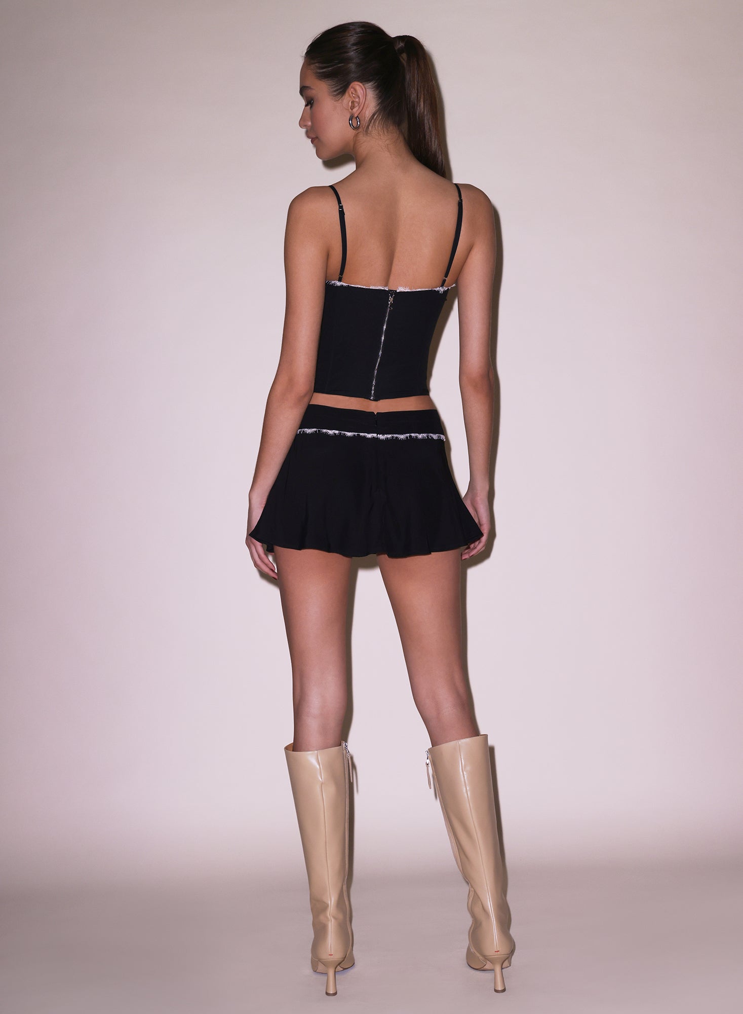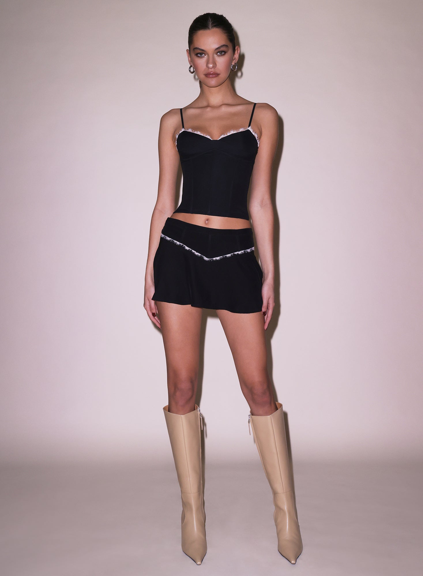 Show some leg in this matte silk mini skirt featuring soft boning for a flattering shape, delicate lace trim, and a flirty flared silhouette. Complete the look with a matching top for a coordinated ensemble.