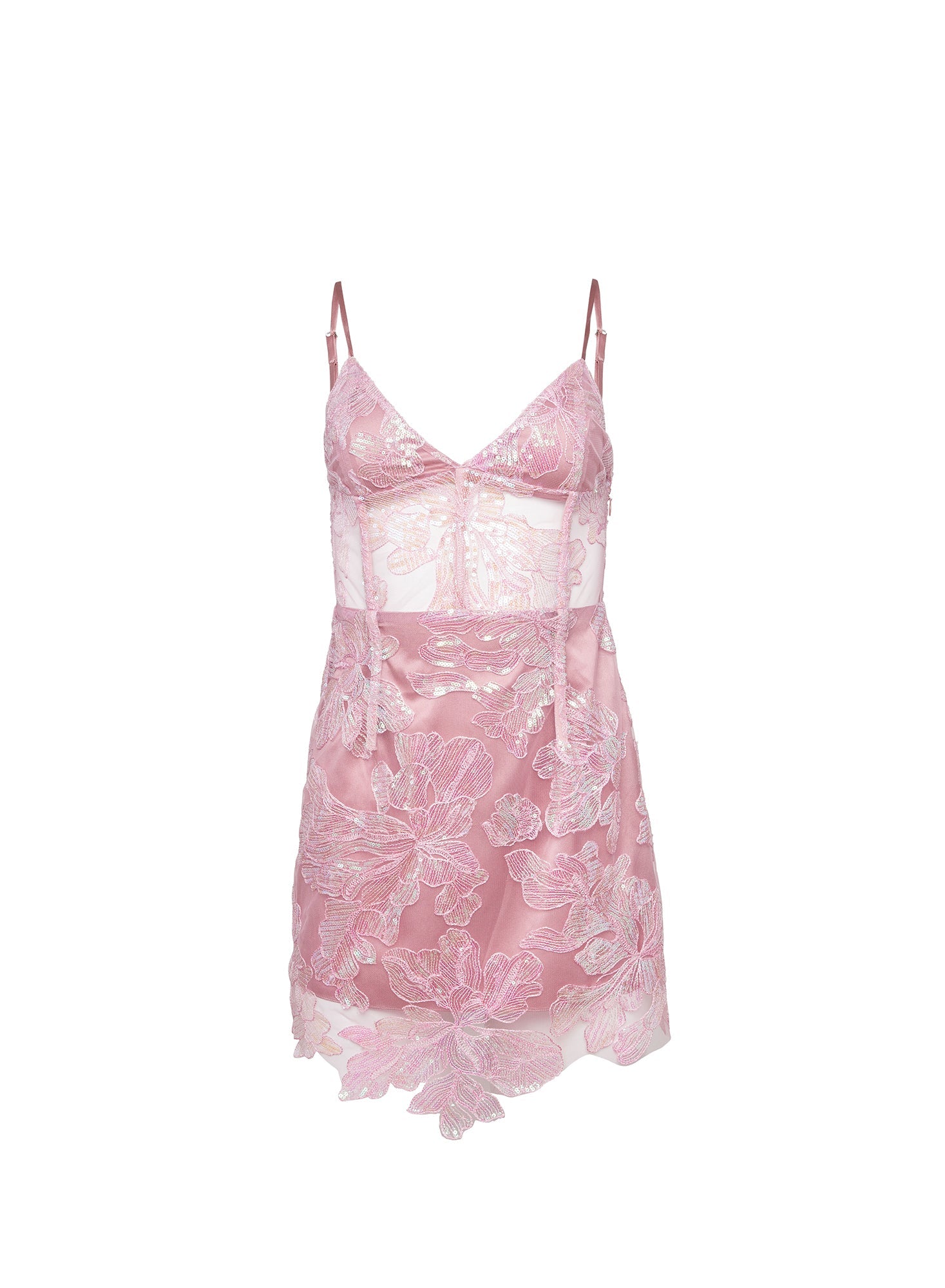 This mini dress features a sheer, boned bodice for a flattering silhouette and adjustable straps for a custom fit, all lined in luxurious silk charmeuse for comfort against your skin. The allover sequin embroidery catches every glimmer of light as you move.