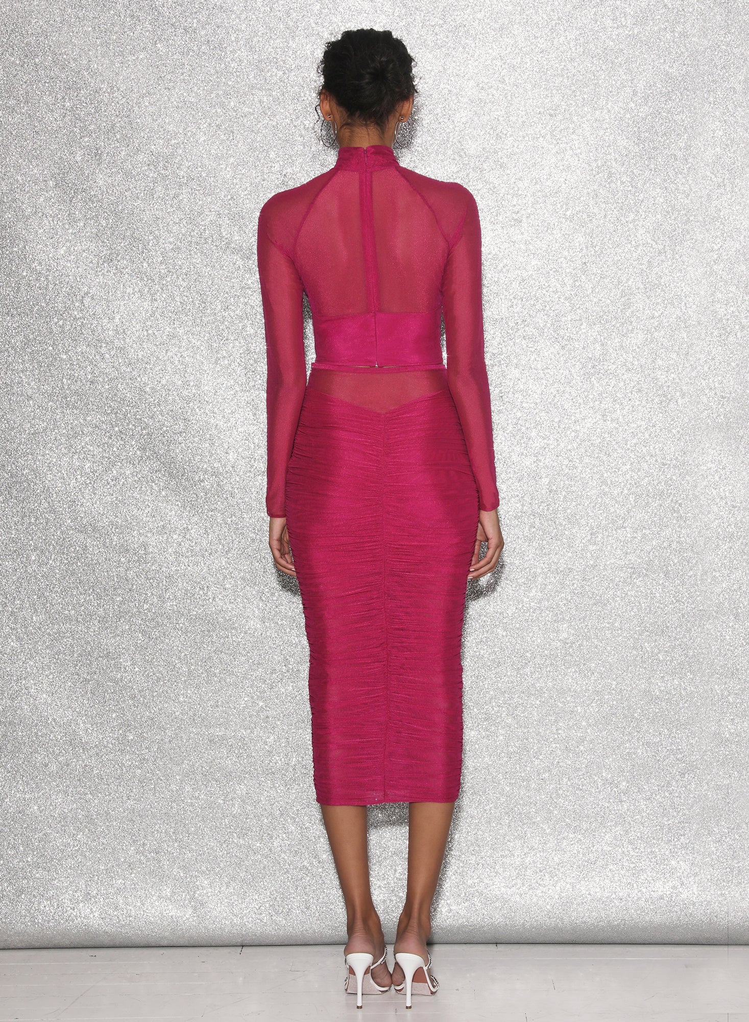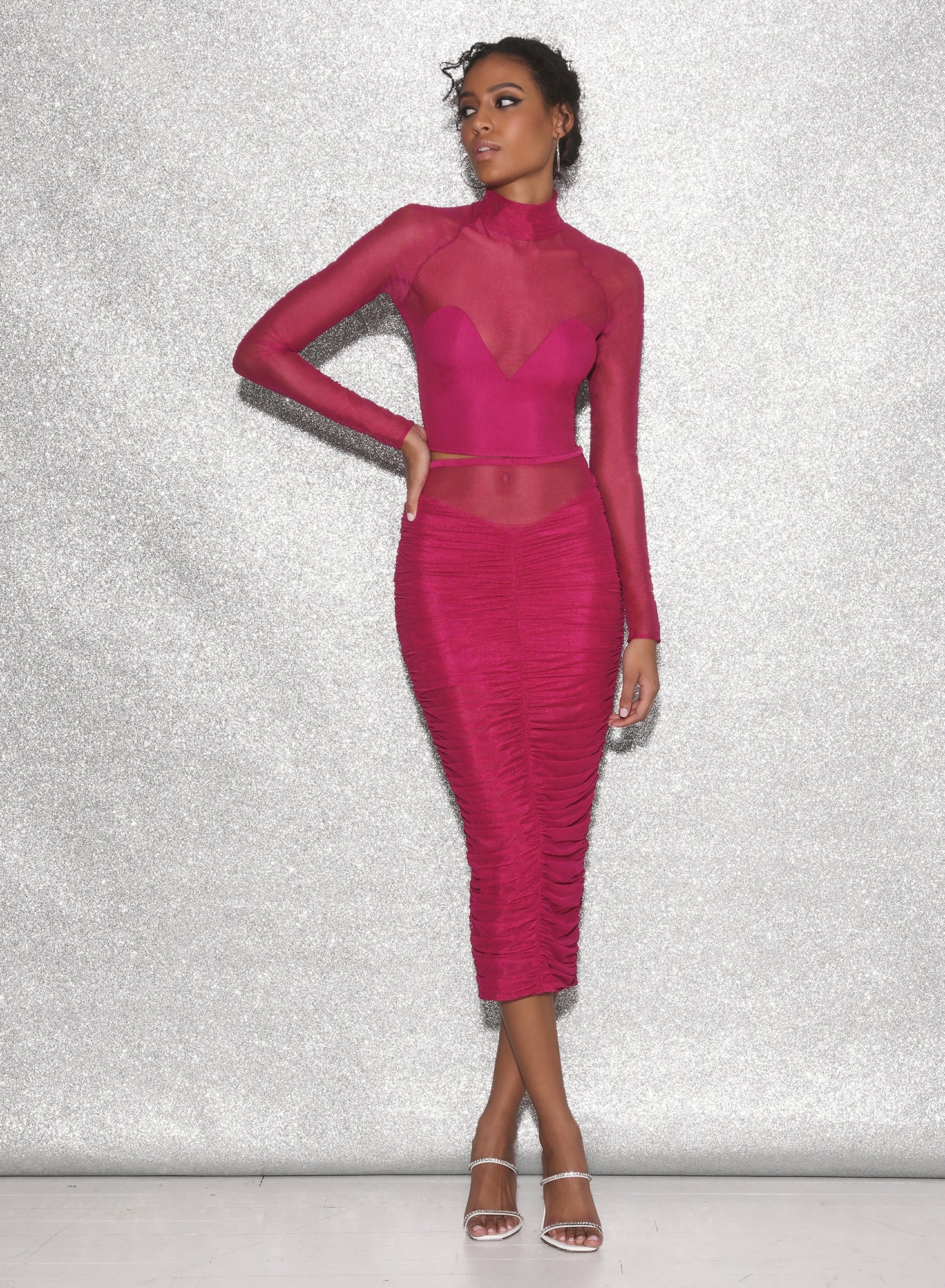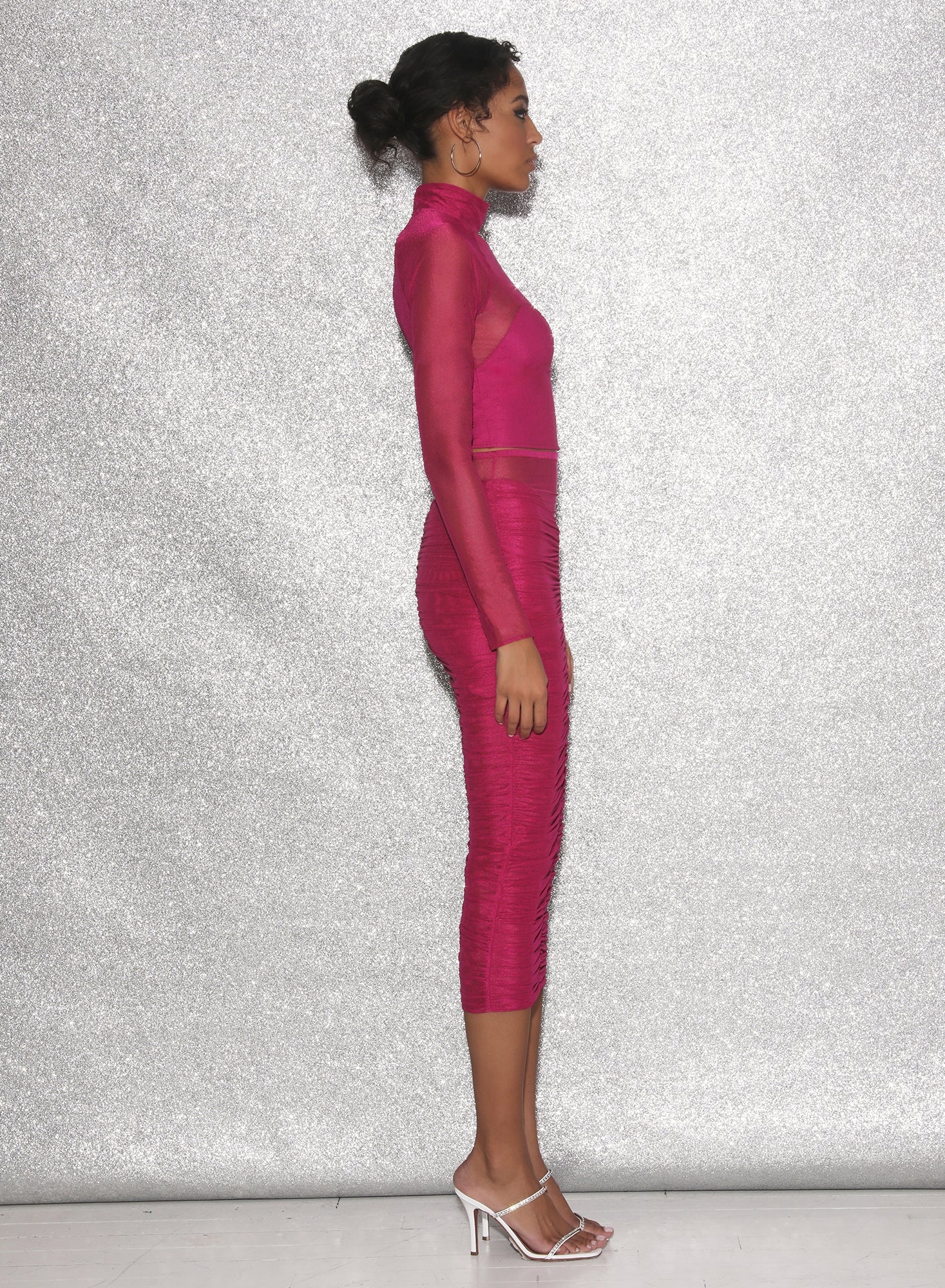 This skirt features soft stretch mesh with delicate allover ruching that drapes beautifully, paired with a comfortable elasticized waist for a silhouette that feels as good as it looks.