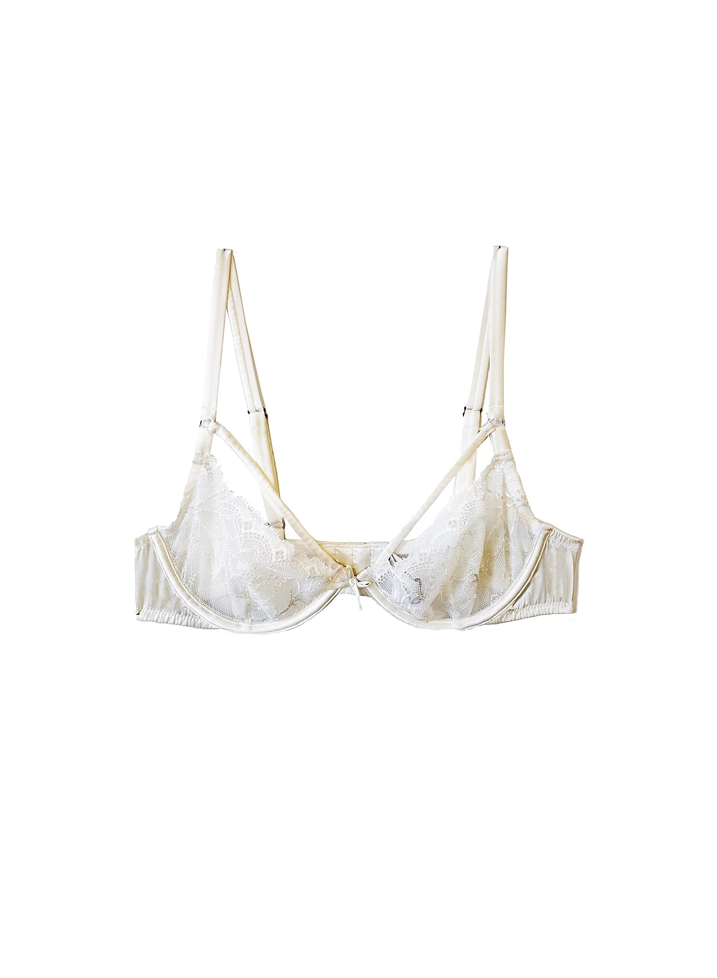 Featuring stunning stretch French Leavers lace with silk front straps that elegantly frame the bust, finished with a charming center front bow detail. The adjustable straps and back hook-and-eye closure allow for a perfectly customized, comfortable fit.