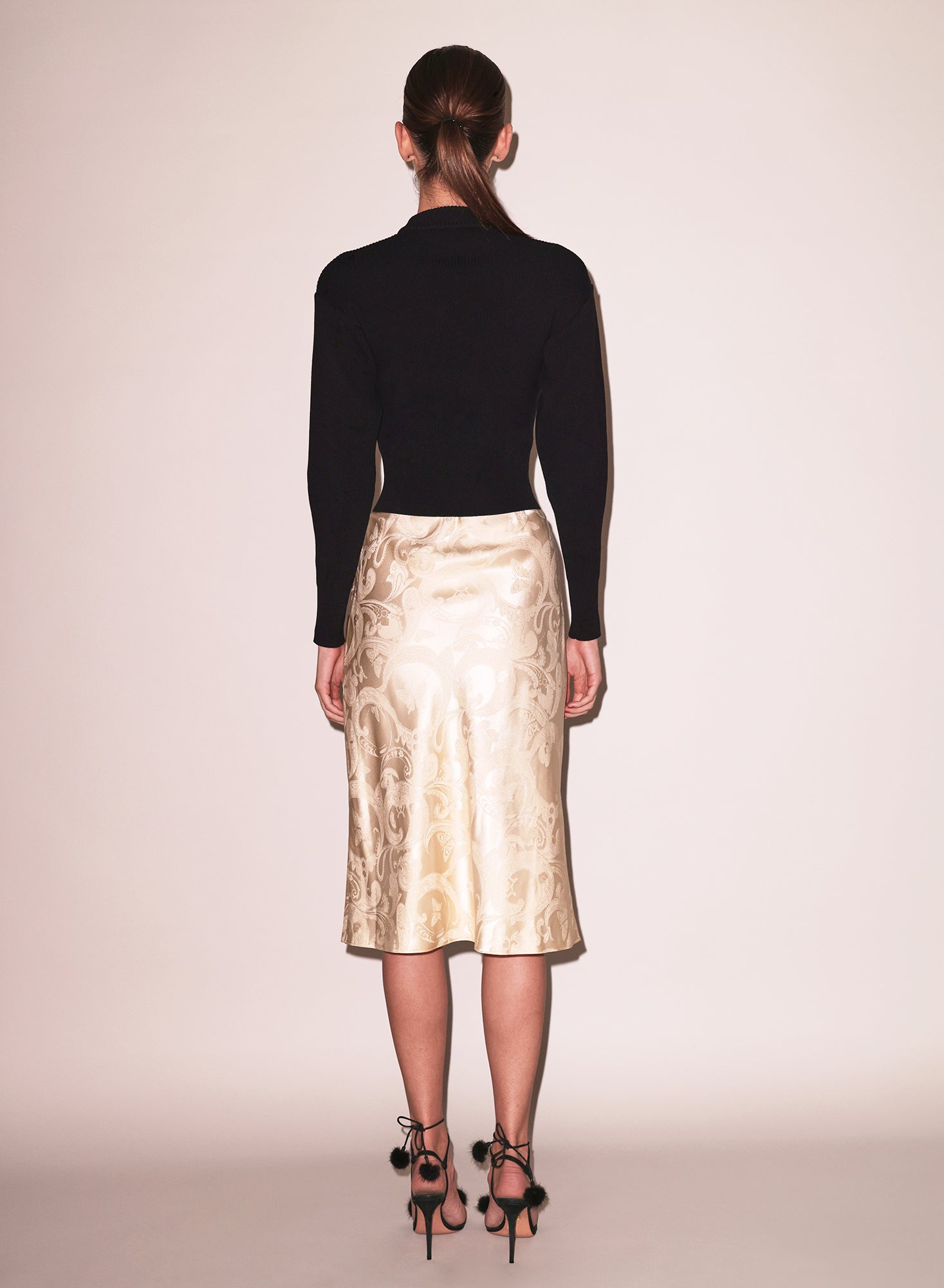 This sweater features a relaxed shoulder cut that flows into a gently fitted waist, creating a flattering silhouette. The delicate lace insert adds a touch of romantic detail, making it a versatile piece that transitions beautifully from day to night.