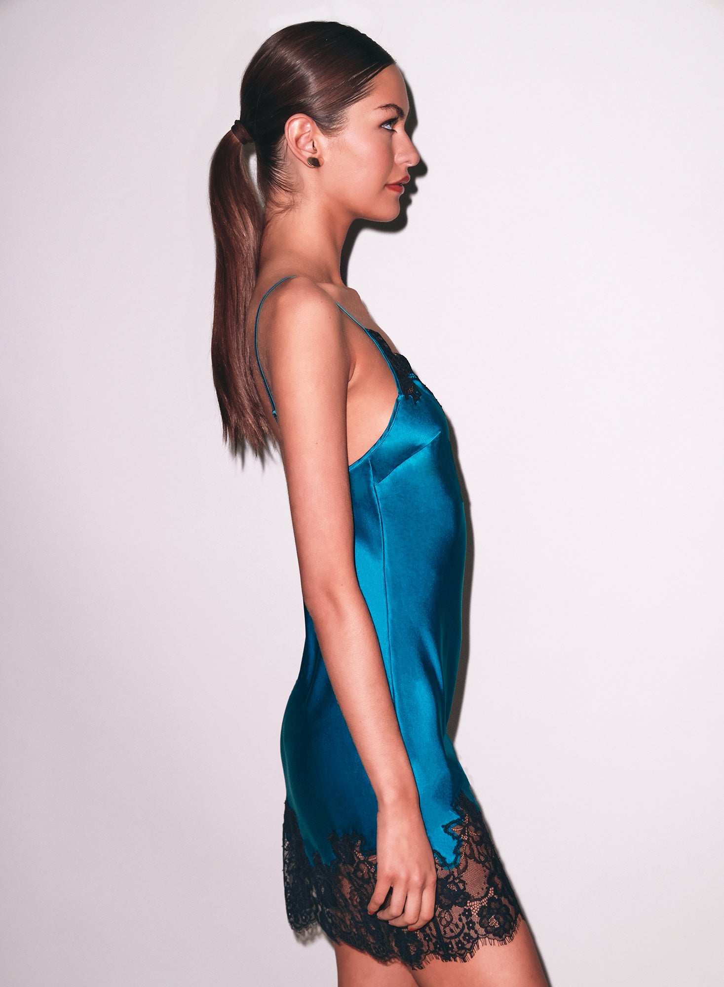 Crafted from luxe silk charmeuse with intricate lace appliqué detailing, featuring adjustable straps and a flirty mini length. Pair it with coordinating lingerie pieces for a complete, enchanting look.