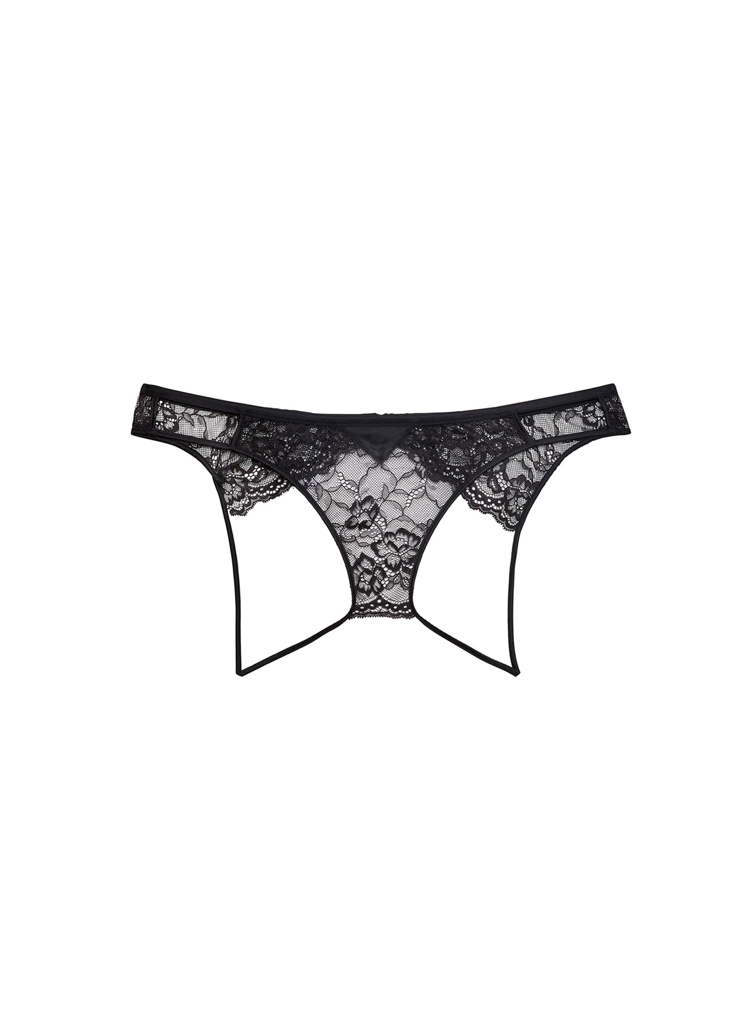 Risqué business in the front, party in the back. Our Bianca Lace Ouvert Panty, cut from comfortable stretch lace with side cutouts. Crotchless with an open back. Complete this seriously sexy set with the Bianca Chain Bra.