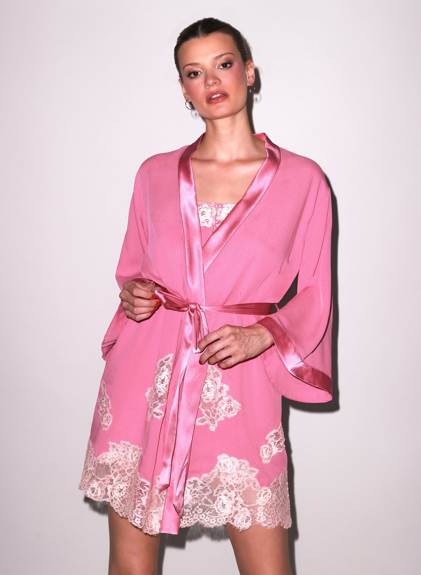 This lightweight silk georgette robe features beautiful lace appliqué details and a playful, flowing fit with wide sleeves. It wraps across the body and is secured by a sash for an adjustable, flattering silhouette. For a complete look, pair it with a matching lace slip.