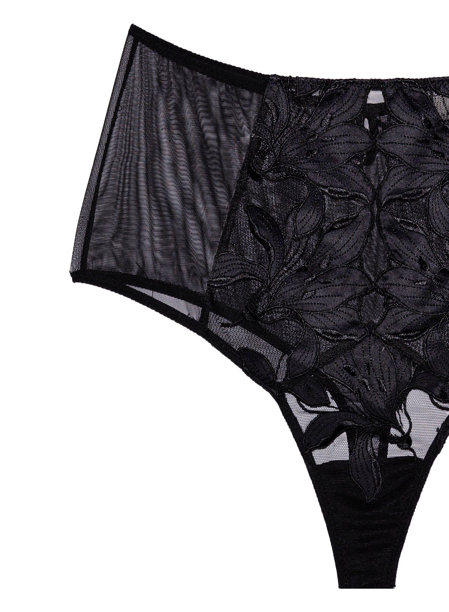 This ultra-flattering high-waist panty features delicate lily embroidery on the front and mesh-paneled sides for a touch of breathable allure. The thong cut in back includes a playful keyhole detail, making it a beautiful foundation piece. Pair it with a matching bralette for a complete and seamless layered look.
