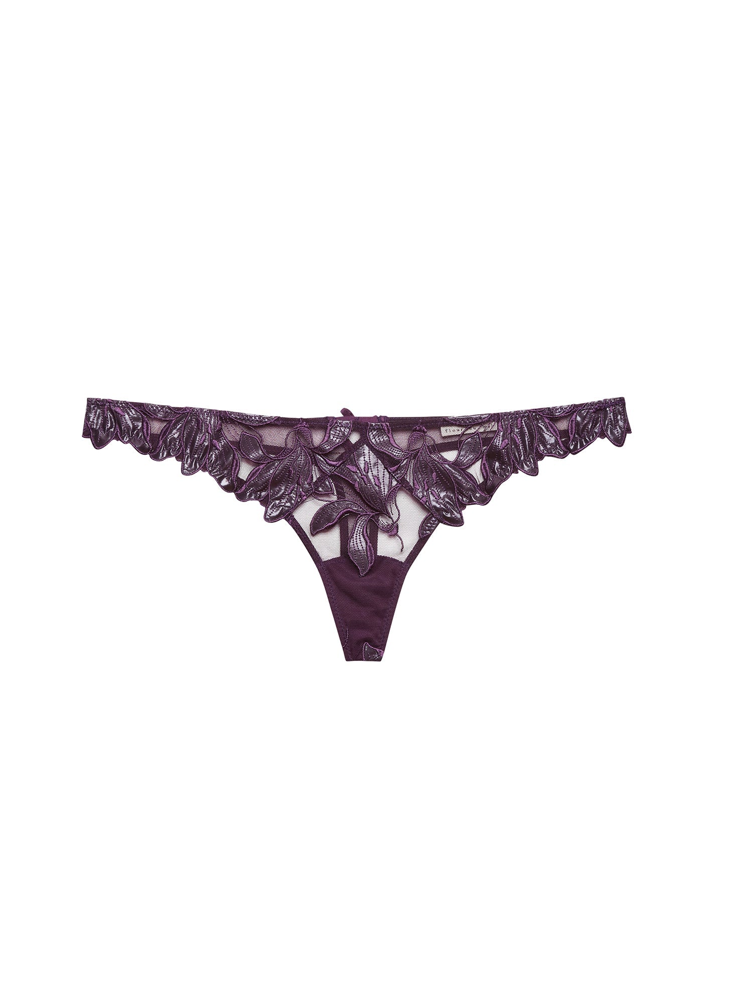 The thong features large embroidered lilies with a soft sheen and playful scalloped edges, paired with a sheer mesh back for a touch of intrigue. It's crafted to pair seamlessly with the matching plunge demi and garter for a complete, coordinated look.