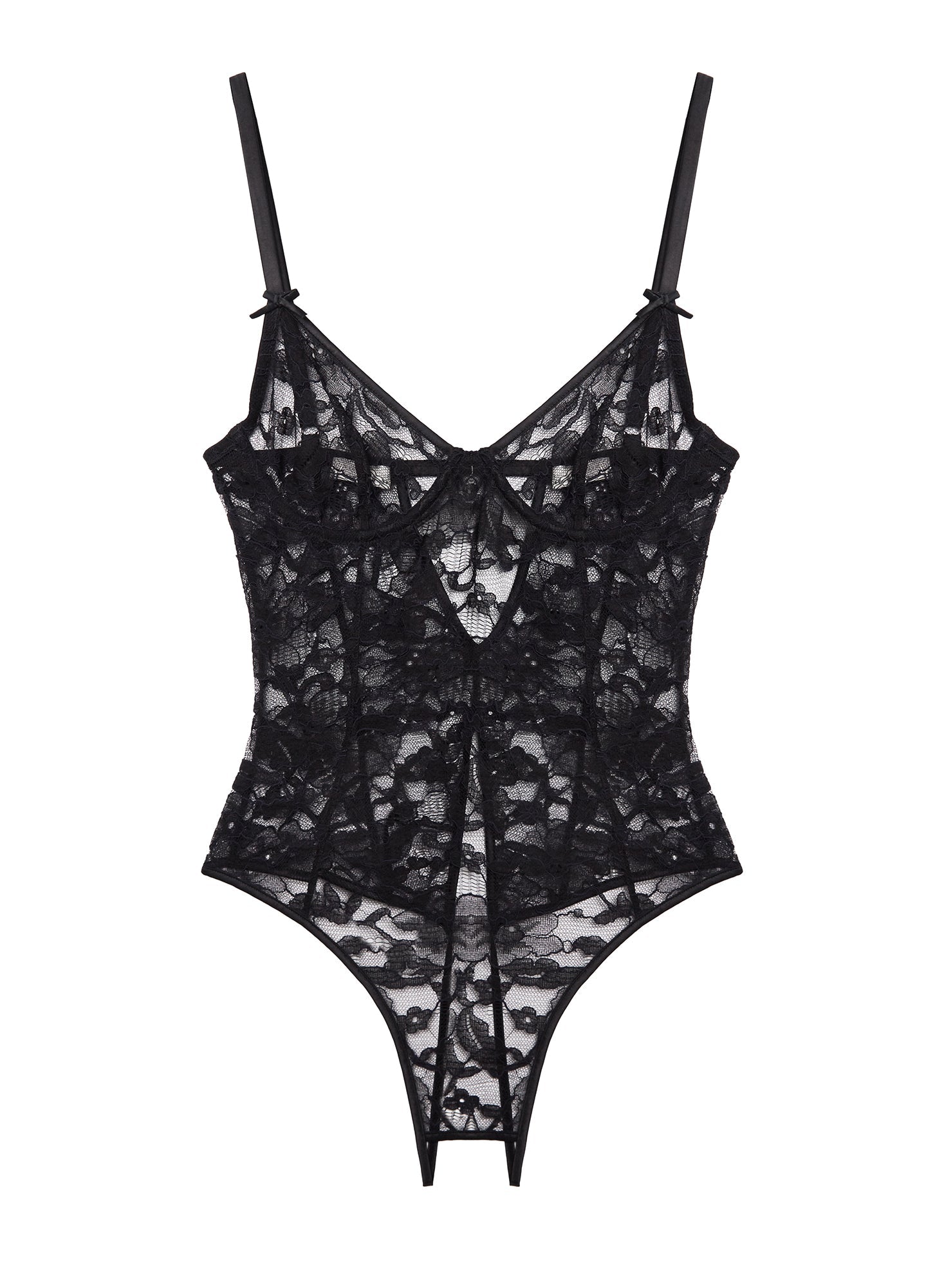 Seriously sexy. Our Magnolia Lace Ouvert Bodysuit in stunning stretch French Leavers lace. Features underwire cups for support, plus adjustable straps for a customized fit. Crotchless with open back. Pair with thigh highs for an unforgettable after dark look.