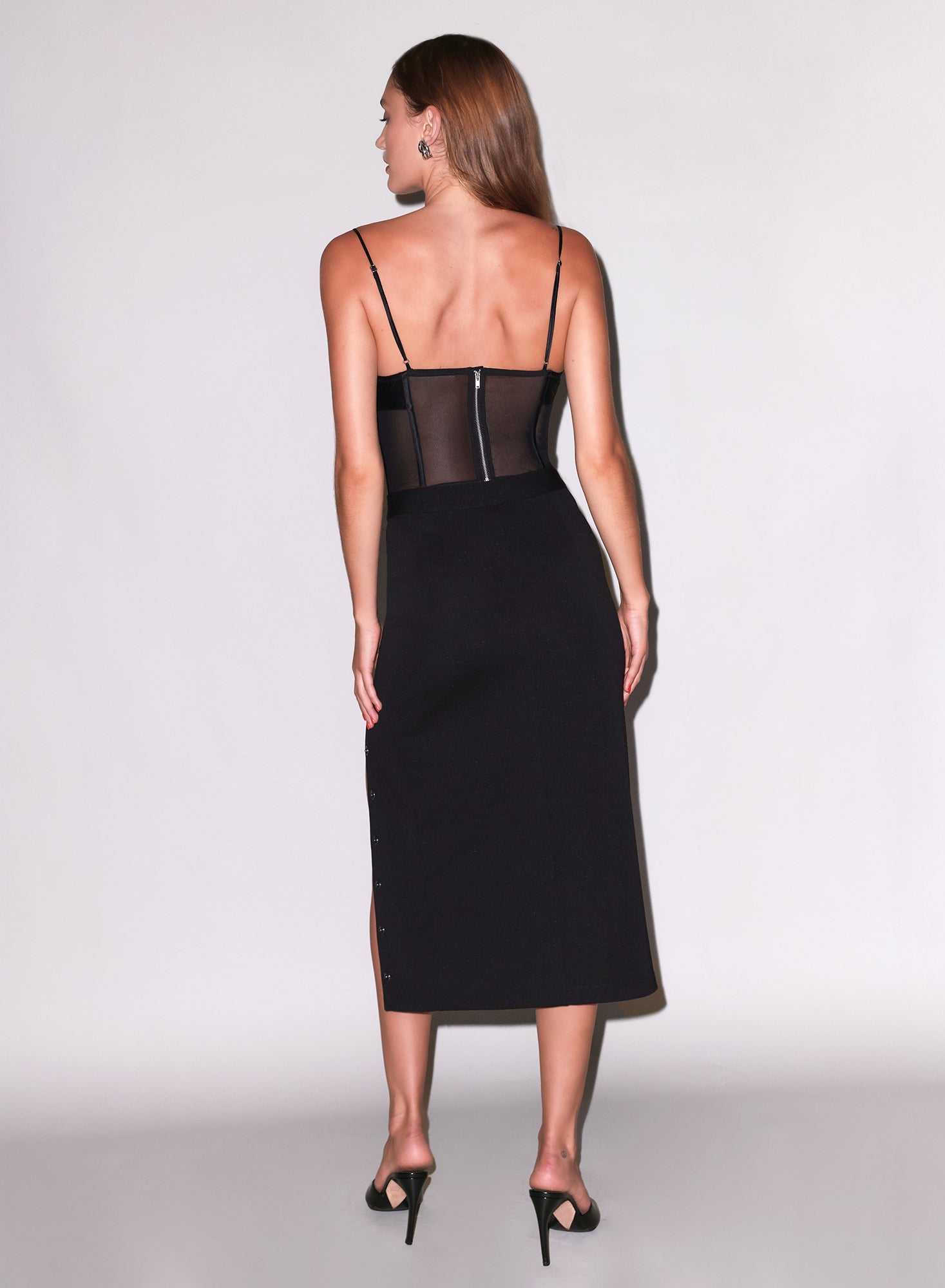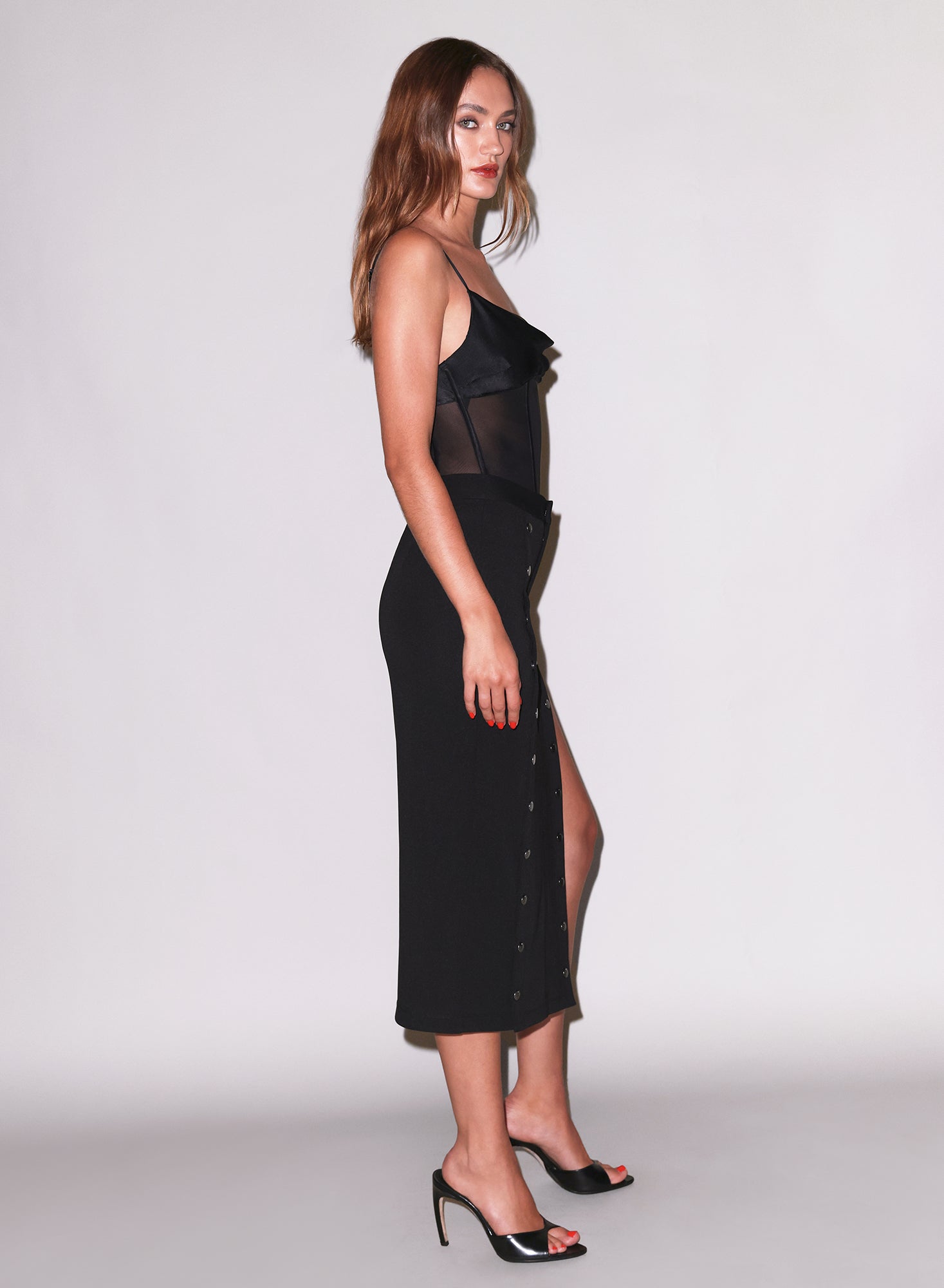 Featuring a stretch silk charmeuse cowl top with a structured powermesh corset and boning at the princess seams for a flattering silhouette. The adjustable straps and exposed back zip closure allow for a personalized and secure fit.