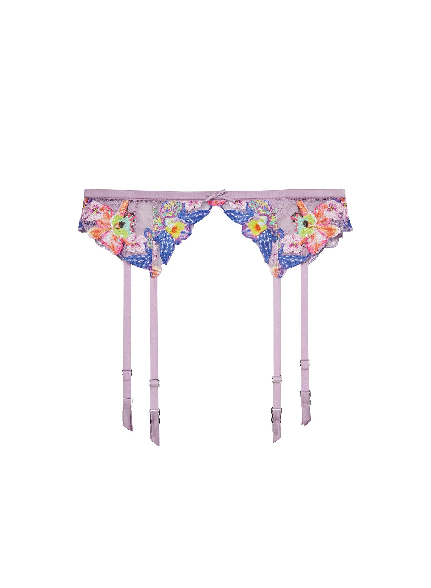 Features custom neon floral embroidery on soft pastel lace, with silk-covered adjustable garter straps and a comfortable elastic waistband. The center back closure sits neatly at the waist for a flattering fit.