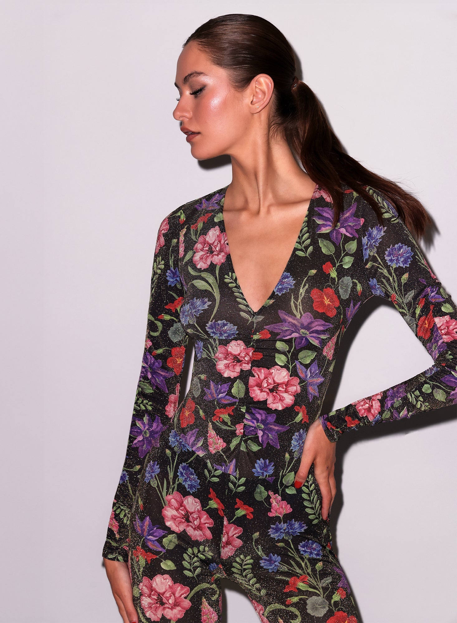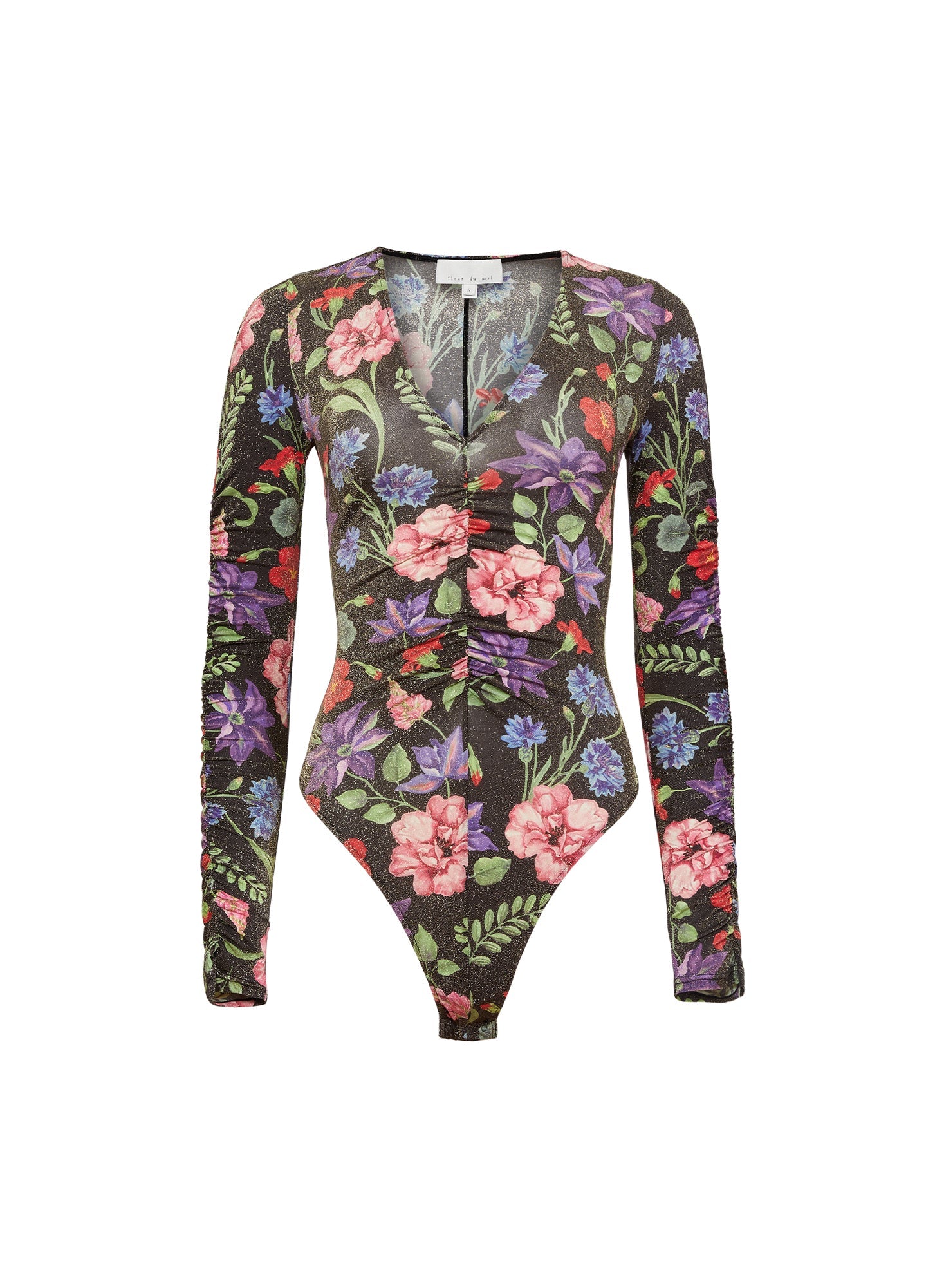 Featuring a deep plunge neckline and a thong cut back with a convenient bottom snap closure, this metallic Italian jersey bodysuit offers a sleek and flattering silhouette.