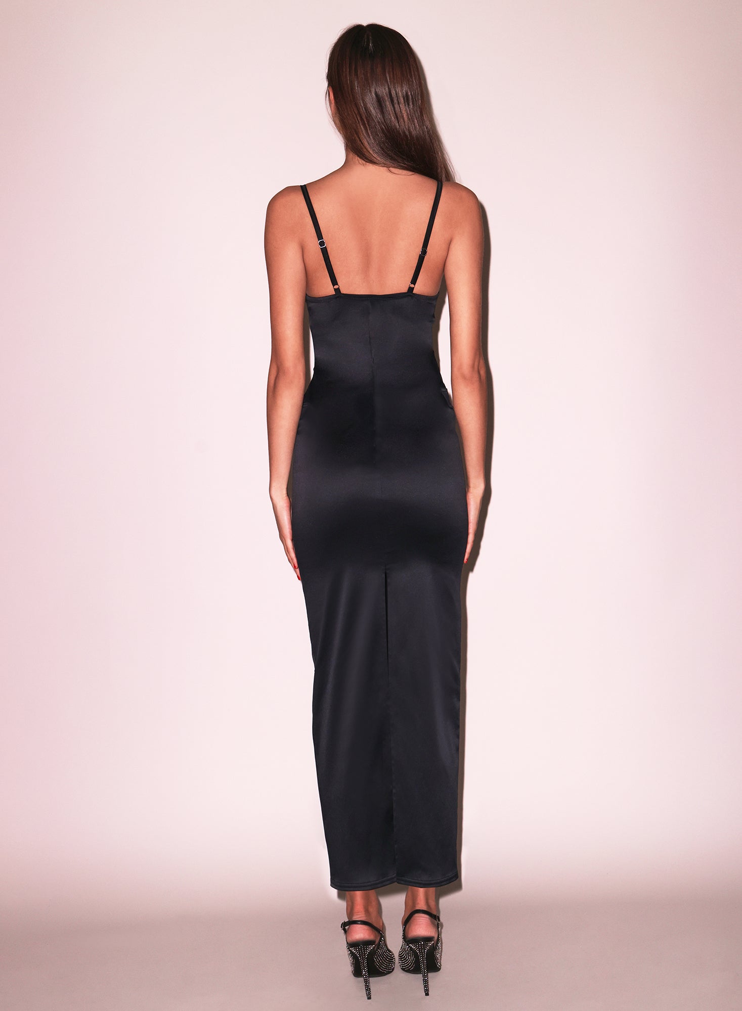 Featuring a plunging cutout neckline with molded cups for lift and shape, adjustable silk straps, and a back slit for elegant movement.