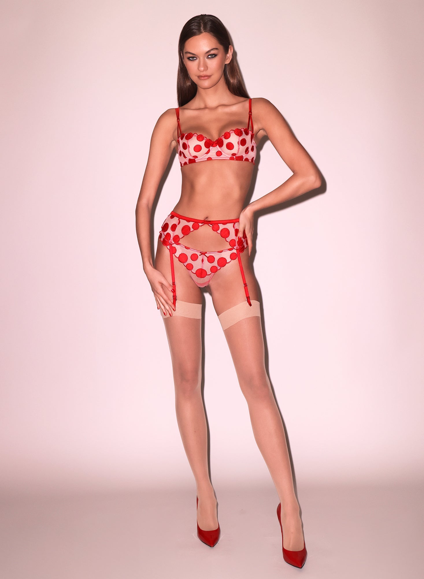 Our garter belt features luxe satin polka dot embroidery with a sheer mesh back for a delicate and sensual feel. The adjustable silk straps and center back closure ensure a comfortable and customized fit that moves with you.