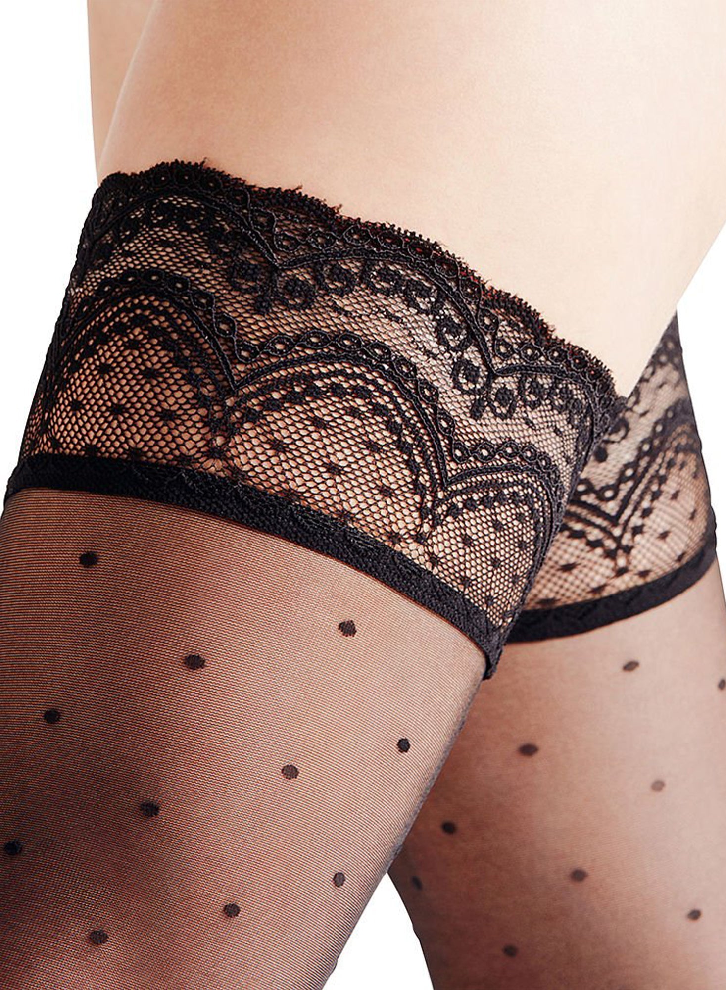 Step out in these sheer matte black tights adorned with polka dots, processed with satin sheer technology for optimal comfort and a perfect, flattering fit. The 15 denier fabric offers a delicate feel while the stay-up design ensures they stay in place.