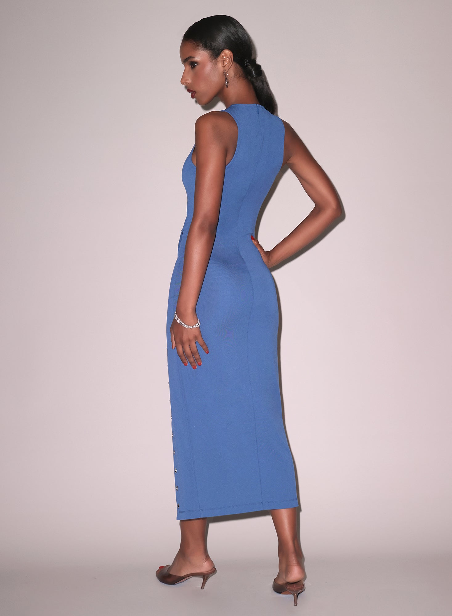 Luxe jersey hugs your body in all the right places, with silver snap buttons to show as little or as much leg as you want. Midi length with a back zipper closure.