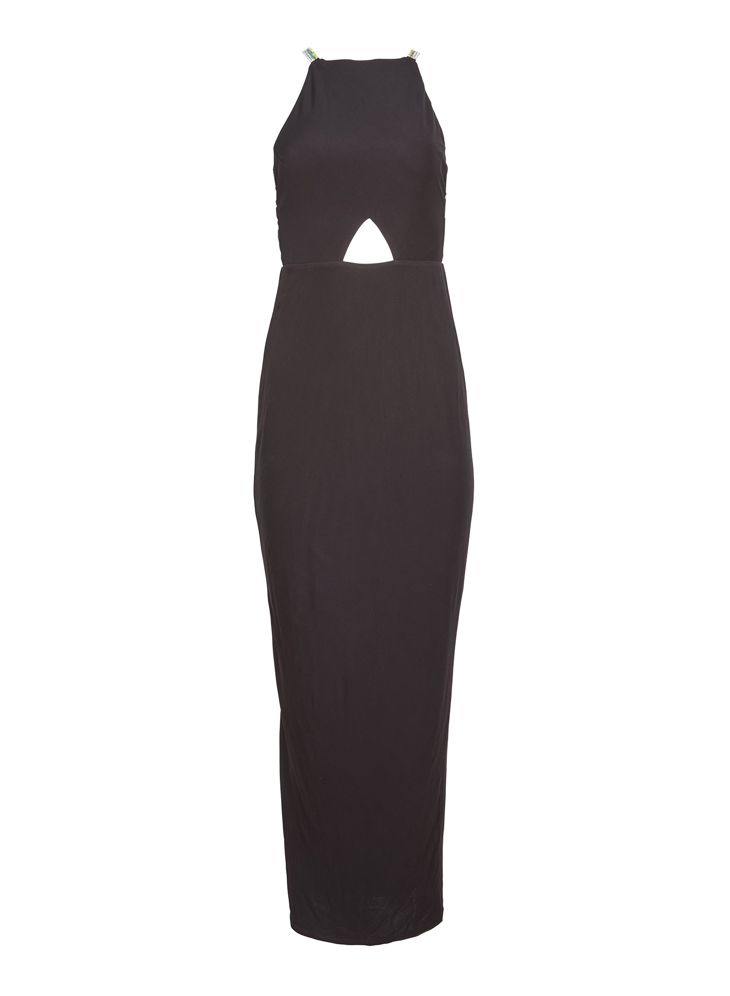 Cut from luxe, soft matte jersey with a flattering racer neck and playful keyhole cutout. Features stunning rhinestone crystal chain straps and a sexy low back with an invisible zipper closure.
