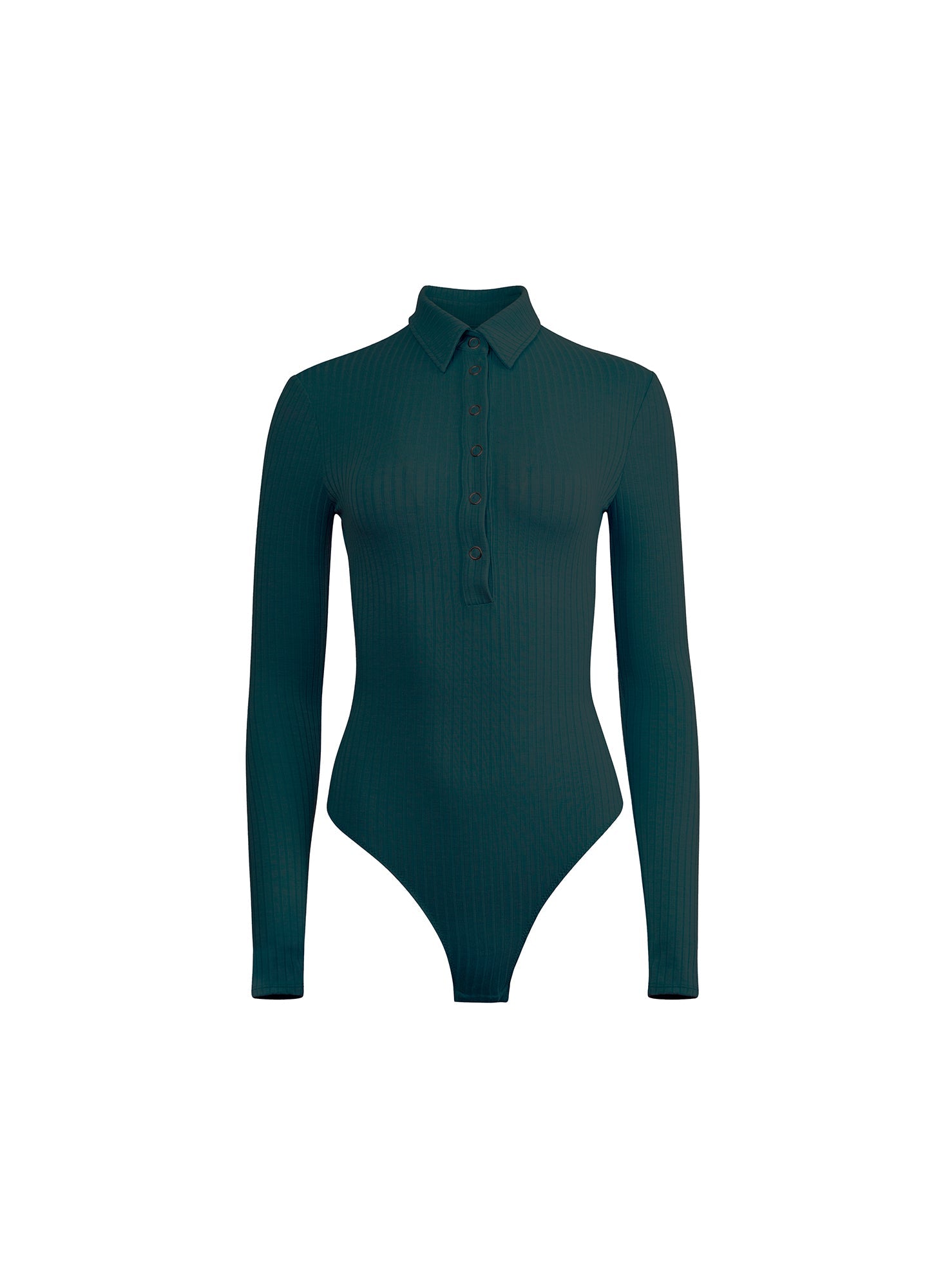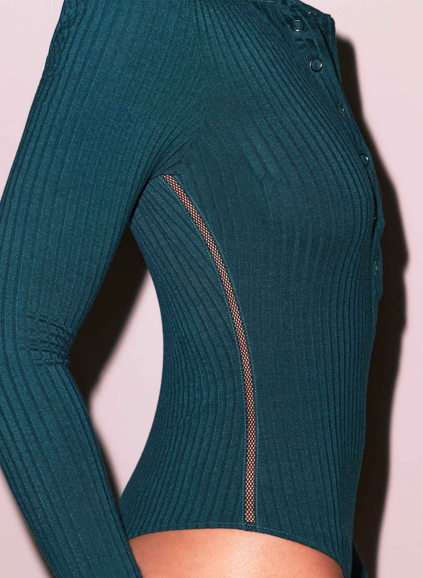 This lightweight ribbed knit bodysuit features delicate lattice lace detail at the sides, a button-up collar, and long sleeves. The thong cut back and bottom snap closure create a smooth, seamless look.