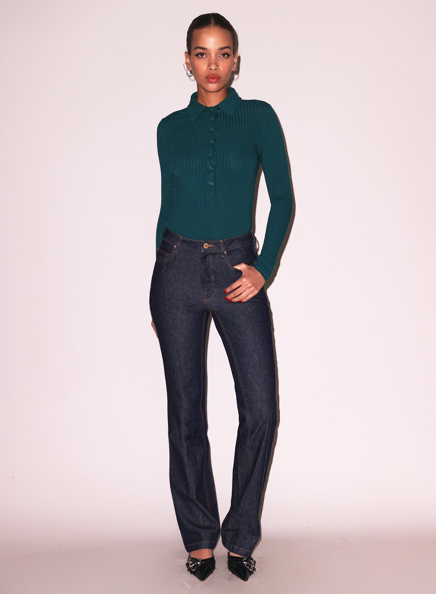 Layer it under a blazer for a smart-casual look or pair it with high-waisted jeans like the Rider Jean for an elevated everyday outfit. The versatile collar allows for different styling options.