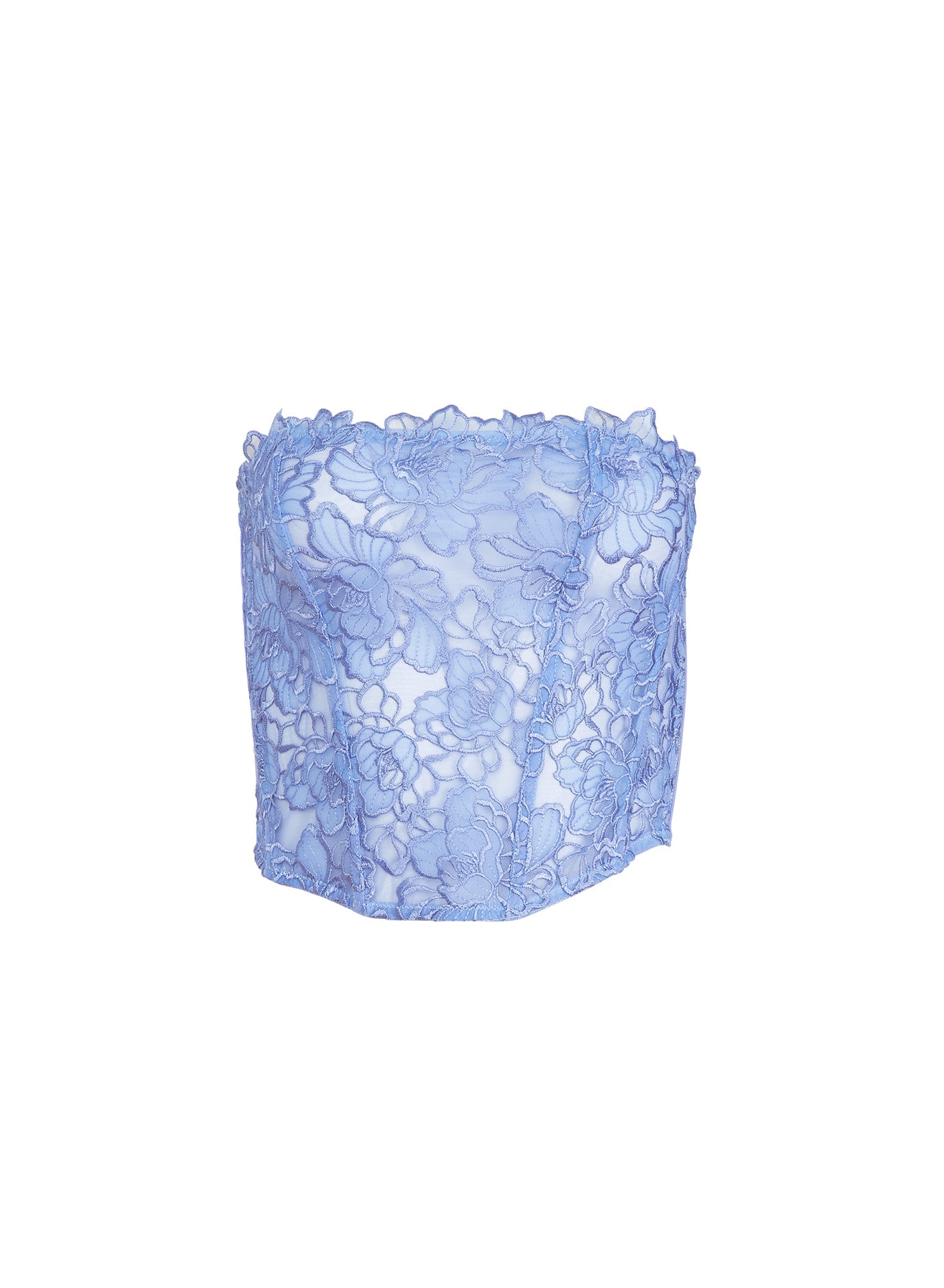 This stunning corset top features delicate Swiss embroidery on sheer tulle with soft boning for a flattering silhouette and a power mesh back for comfort. The exposed side zipper adds a modern touch.