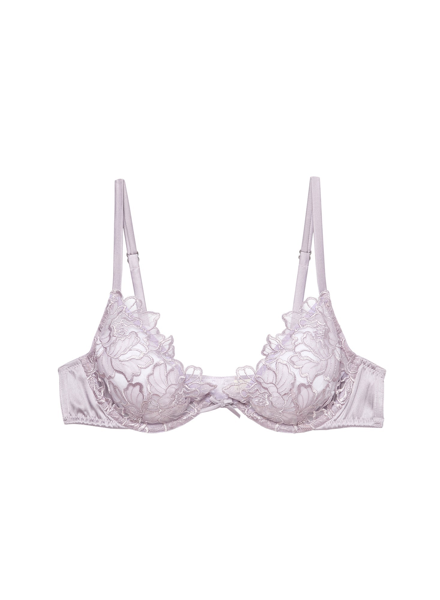 Featuring custom Swiss embroidery with organza on a sheer tulle ground, this demi bra offers ultra flirty scalloped cups adorned with a silk front bow. The adjustable silk-covered straps ensure a personalized and comfortable fit, while the elegant details create a look that is both sophisticated and playful.