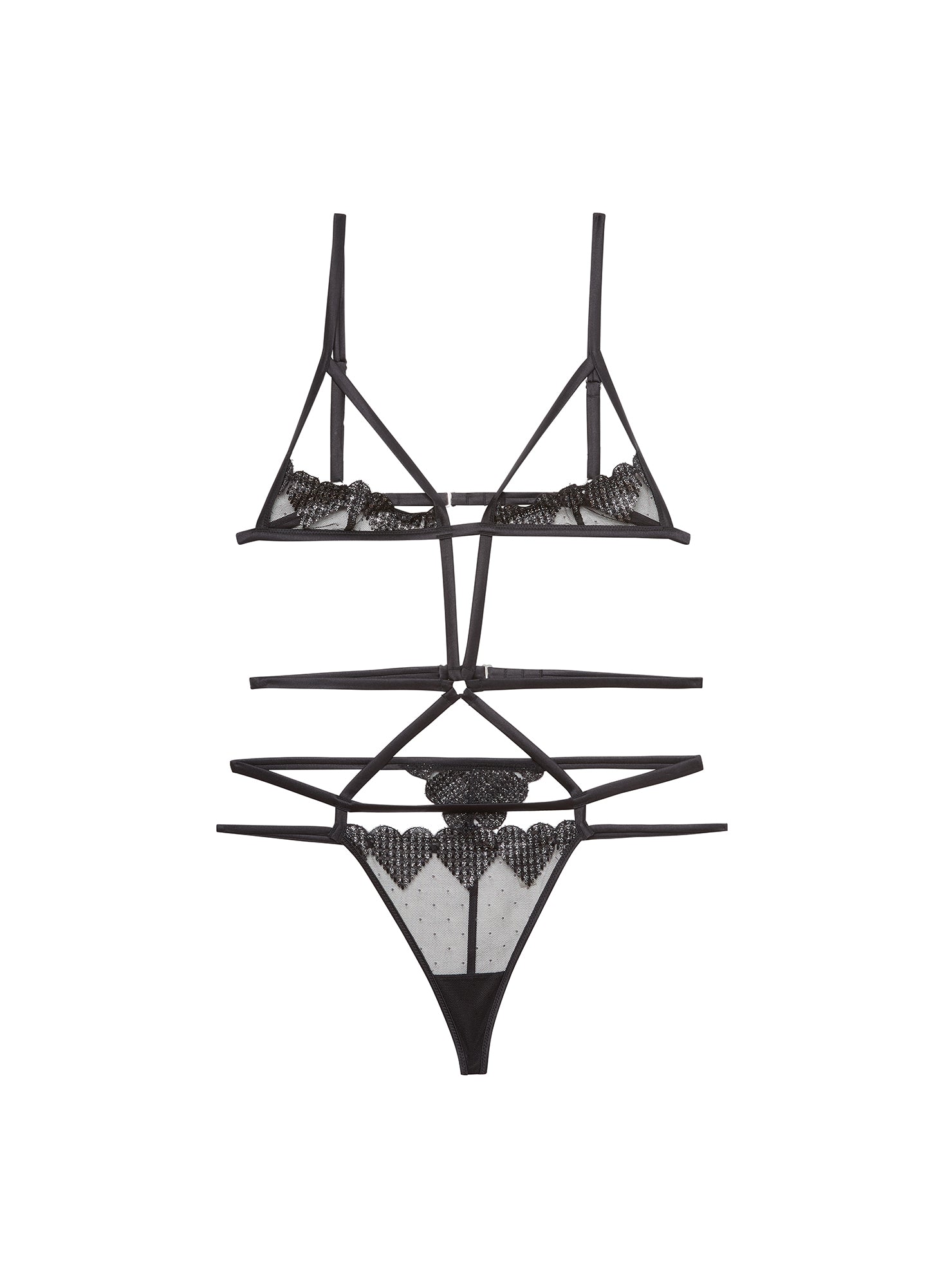 Features smooth, lustrous heart embroidery details with luxe silk straps crossing throughout the torso and back, paired with open cups and a barely-there thong back for a captivating silhouette.