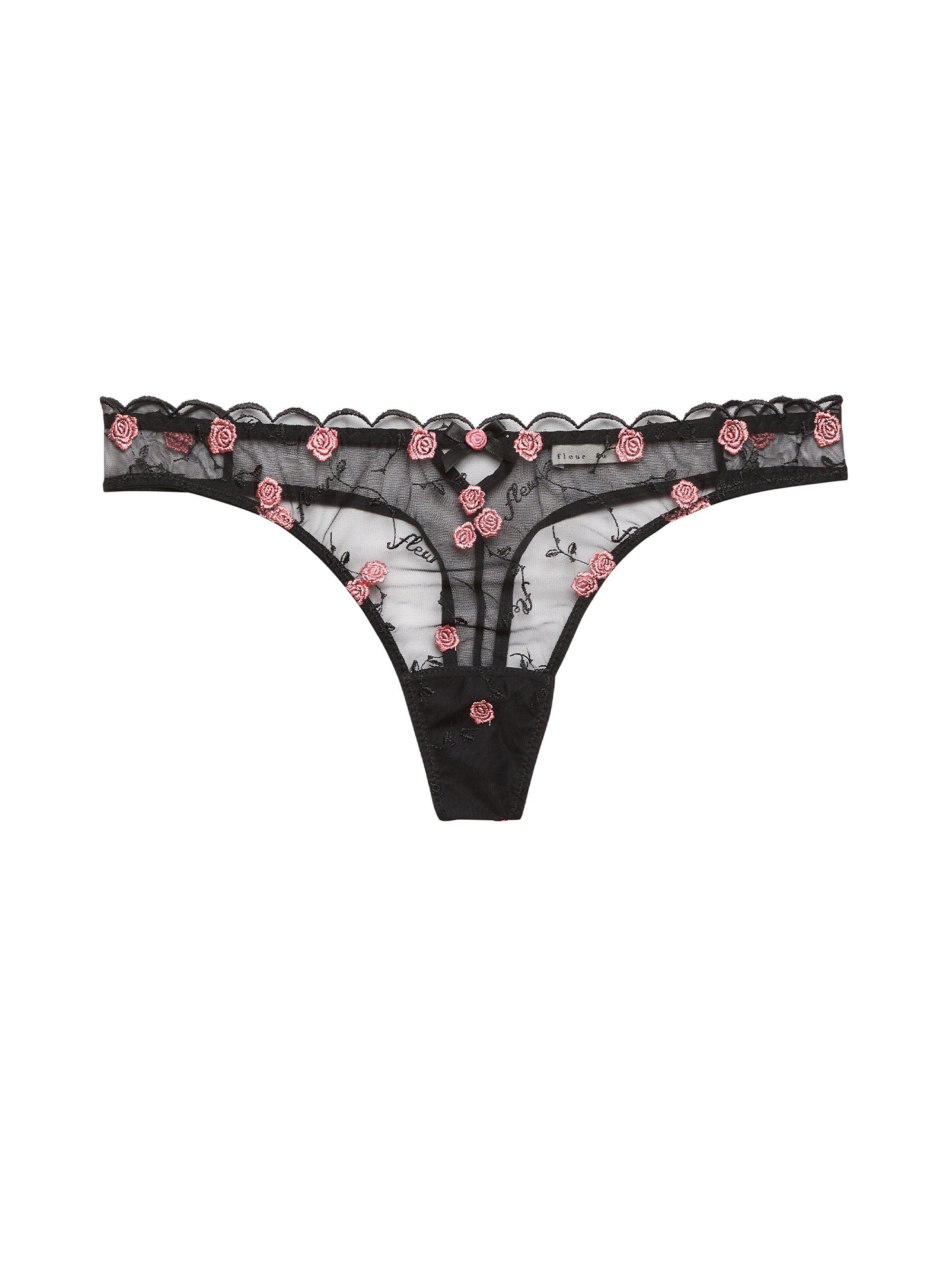 Featuring custom rose embroidery with a delicate script logo and a sweet rosette bow detail. The flirty scalloped legline and sheer mesh back add a touch of playful elegance.