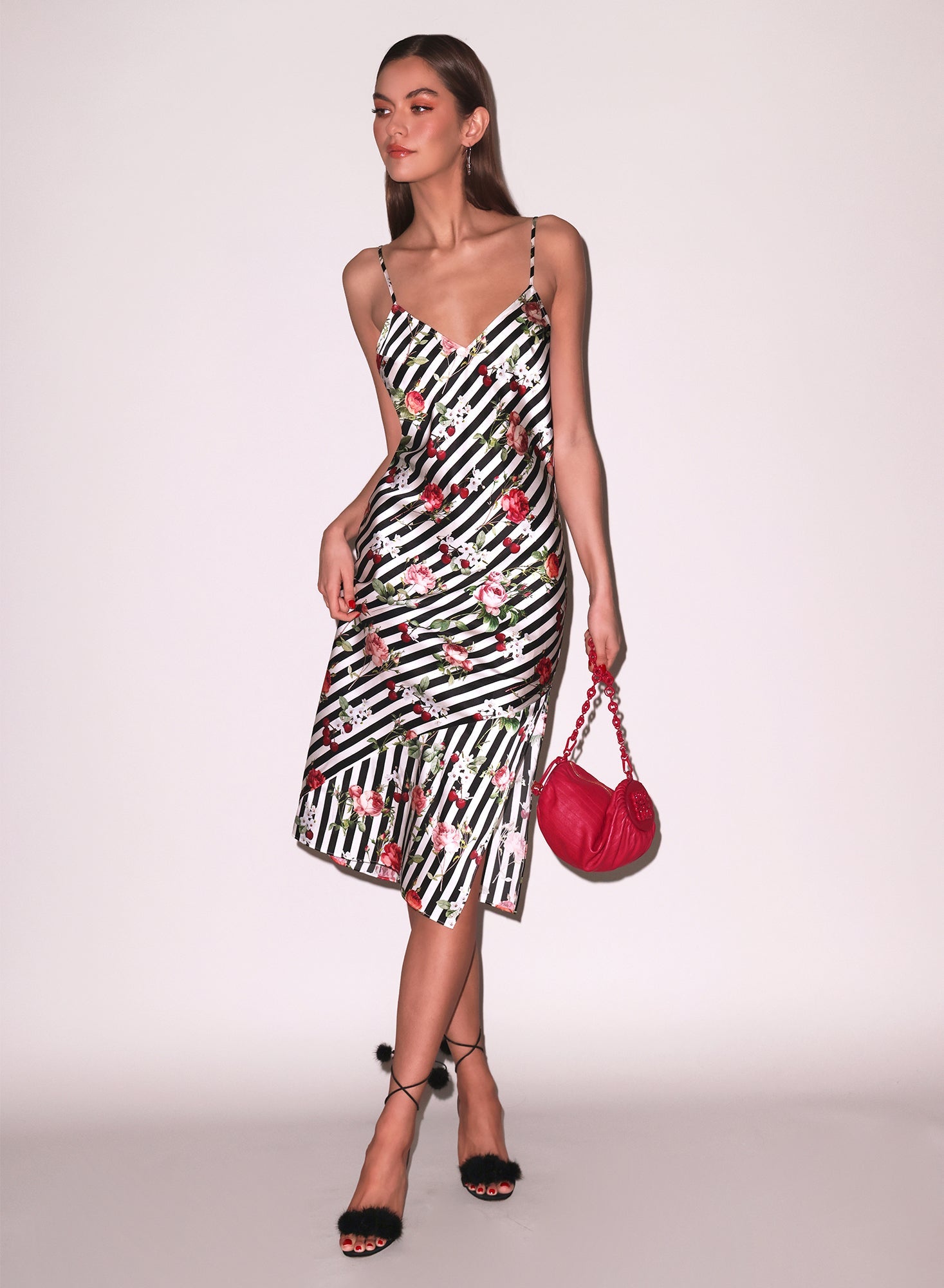 Cut from bias-cut silk charmeuse with a soft striped rose and cherry print, this slip features a flattering V-neckline, a subtle side slit, and adjustable straps for a personalized fit that falls just below the knee.