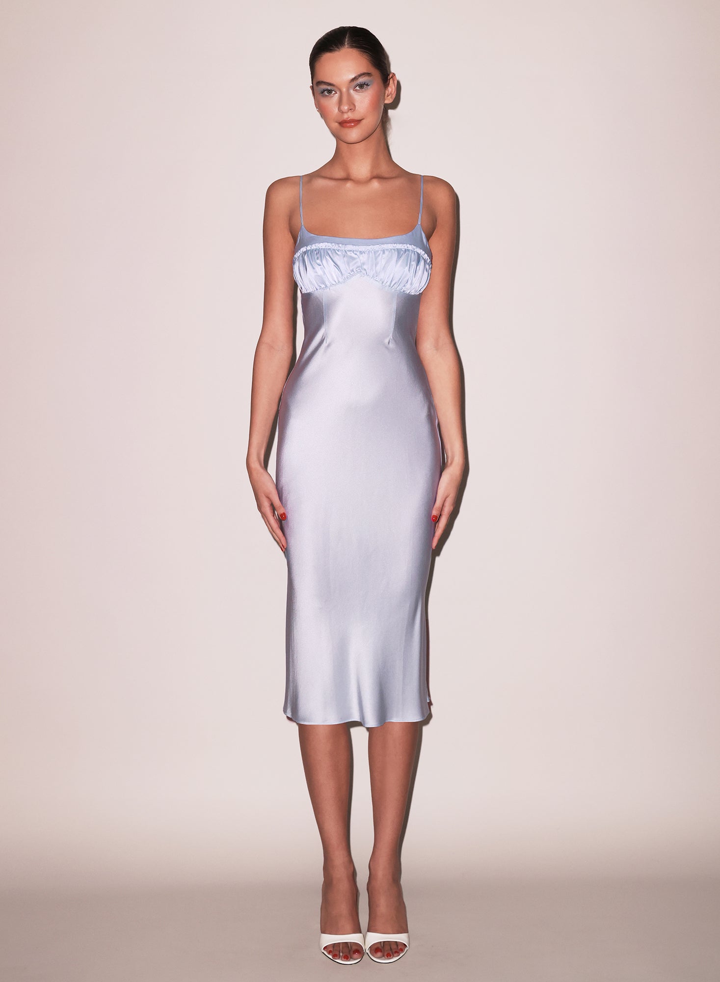 Featuring a flattering scoop neckline with delicate ruching at the bust and mini ruffled edges, this luxe bias-cut silk dress drapes beautifully. The adjustable shoulder straps and midi length that hits just below the knee create a timeless silhouette.