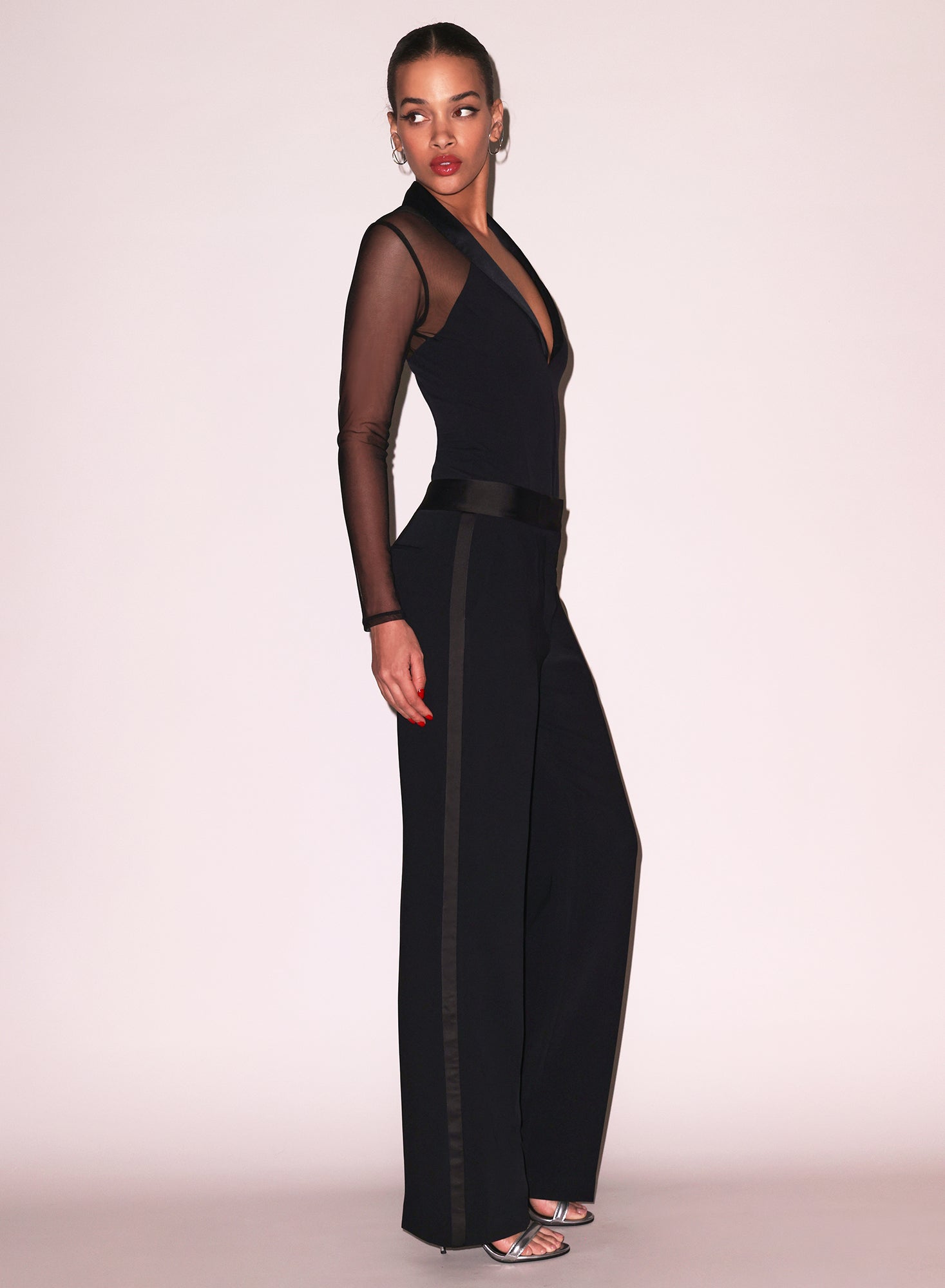 Style it with a matching bodysuit for a complete tuxedo-inspired look, or pair it with a simple camisole and blazer for modern evening elegance.