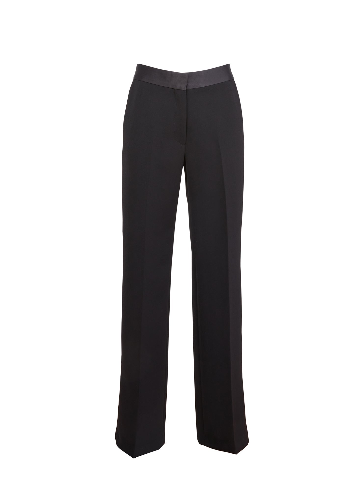 Featuring a flattering mid-rise with a silk satin waistband and sleek side stripe, this pant offers a curtained waist detail and front zip closure for a polished silhouette.