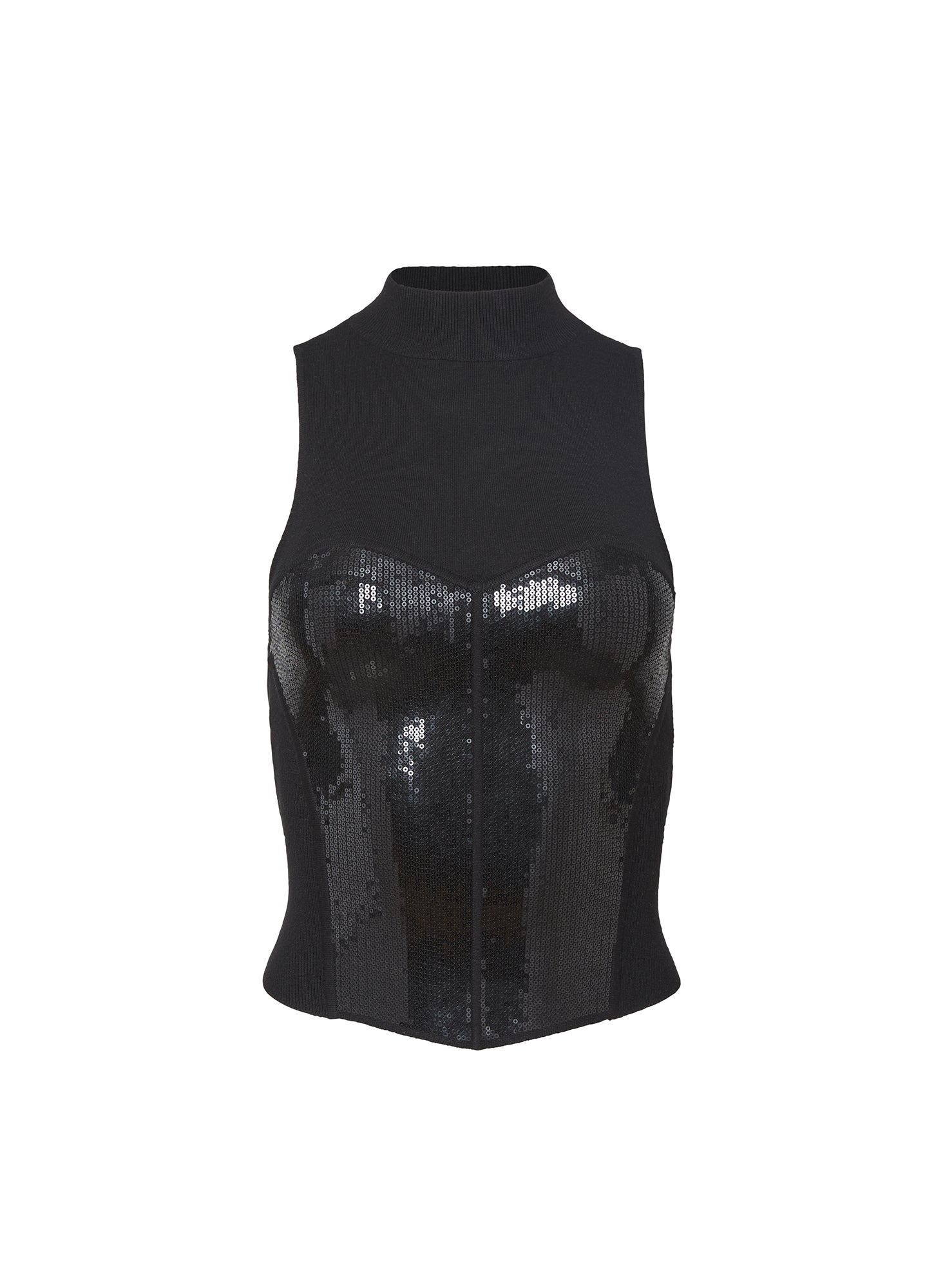 This soft structured ribbed knit top features a sequin bustier panel that hugs your body in all the right places, creating a flattering silhouette. The mock neck adds a touch of modern elegance to the design.