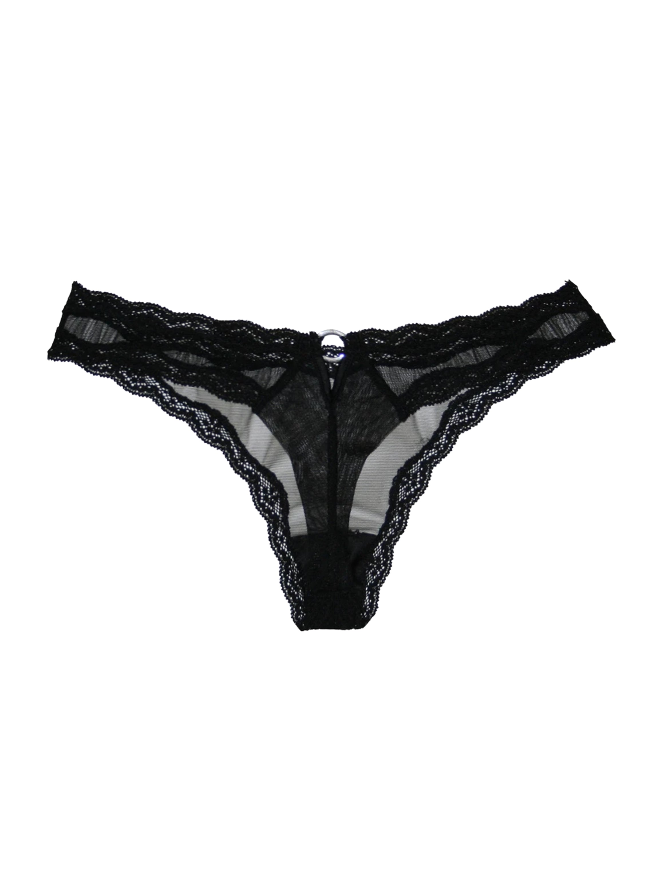 Ideal for every day. Soft stretch Italian tulle thong lined with flirty lace trim. Subtle silver ring and playful keyhole at back. Pair yours with matching Sheer Tulle Demi Bra.