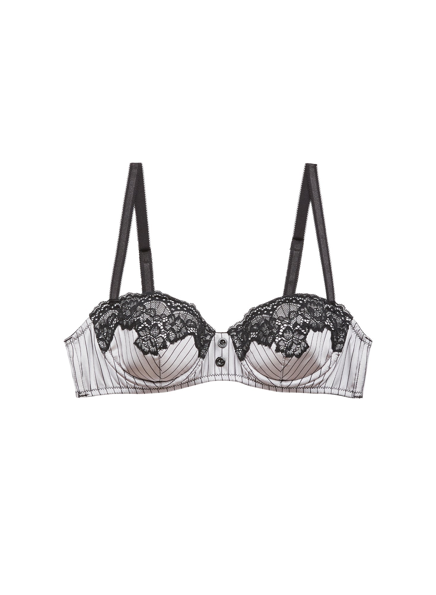 Featuring pinstripe silk underwire cups with scalloped lace that gently hugs the bust and a delicate front button detail. Built-in padding with a silk lining provides subtle shape and lift for a refined silhouette.