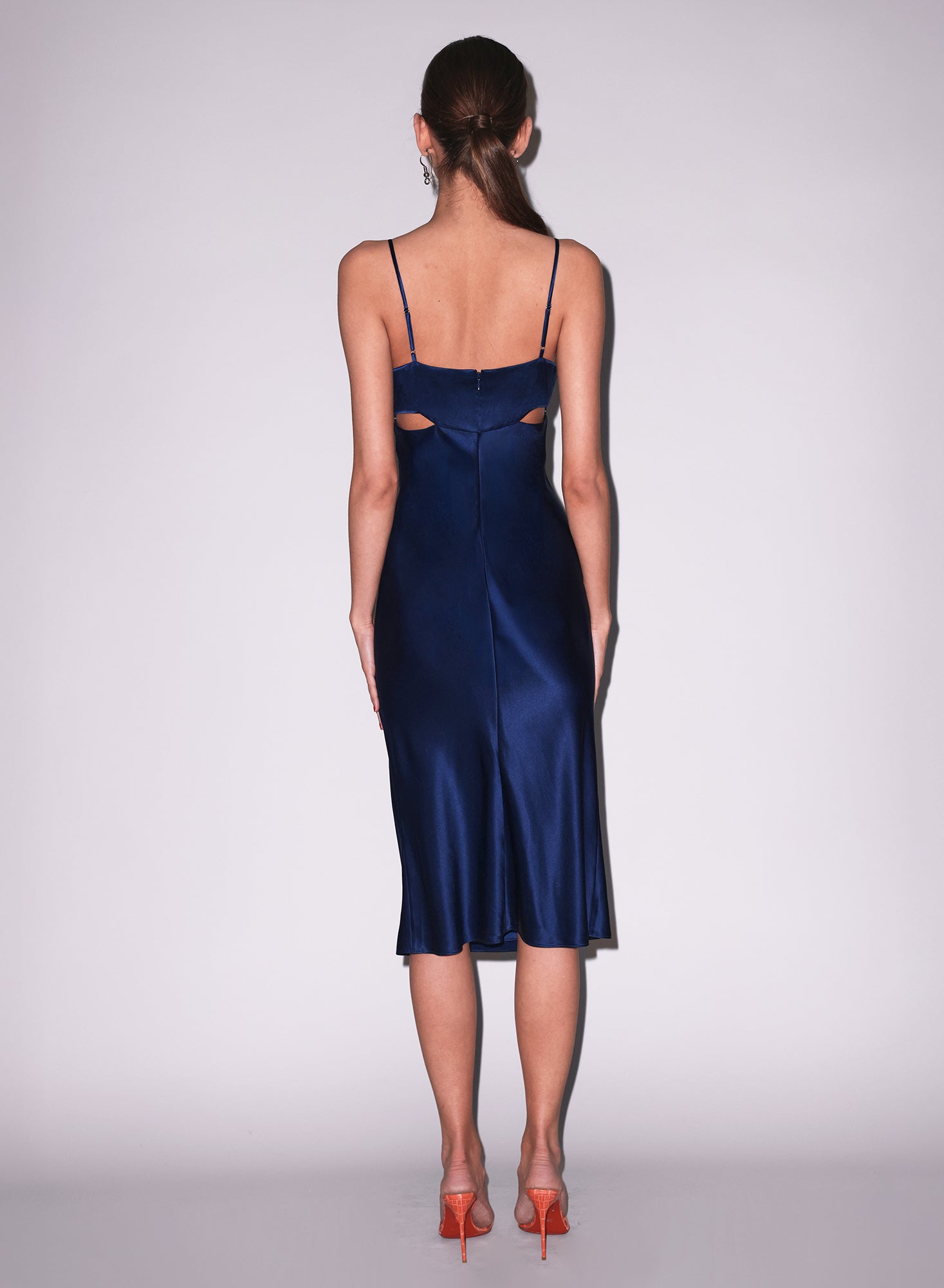 The bias cut silk charmeuse drapes and hugs your curves, while the lattice ring cutouts offer a subtle, sensual reveal. The midi length creates a timeless silhouette.