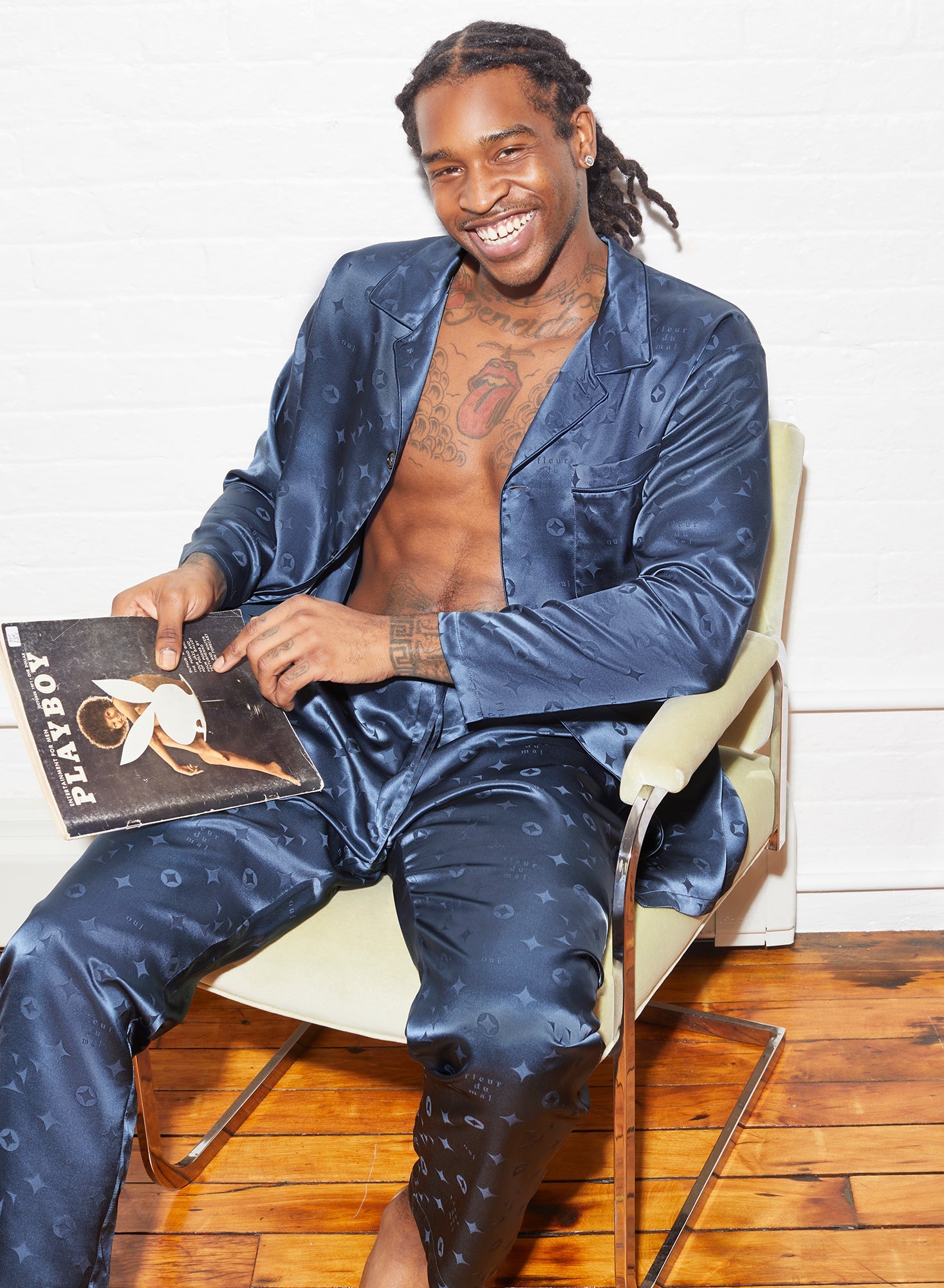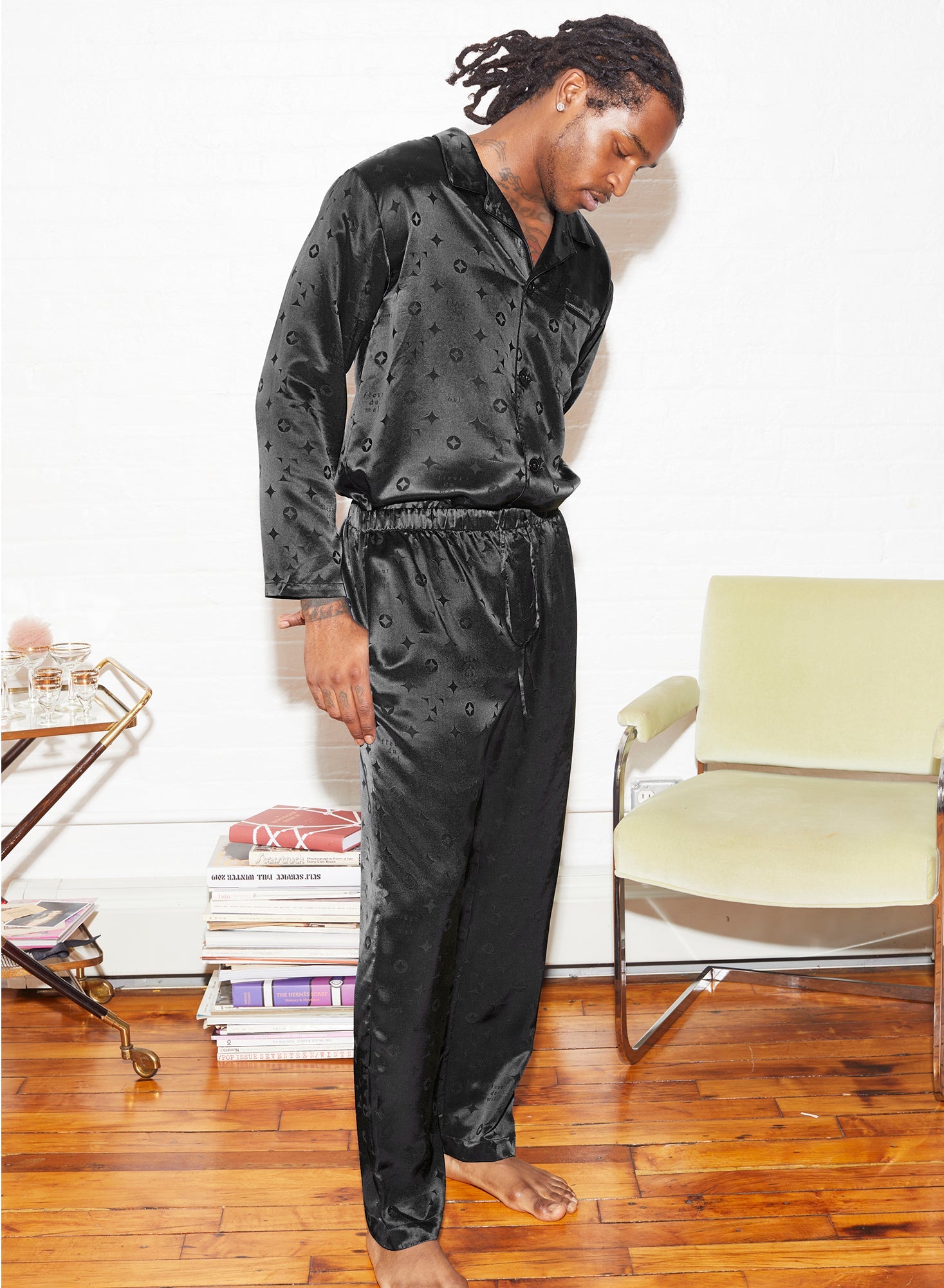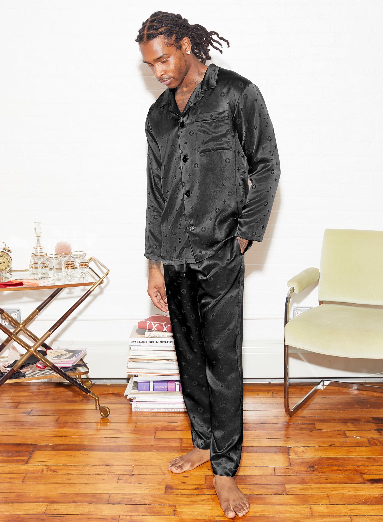 Ultra luxe. Decadent silk satin pajama top in our new Fleur monogram print. Featuring front buttons and pocket detail. A relaxed, drop shoulder fit. Complete the set with the matching Silk Jacquard PJ Pants or Men's Bouquet Lace Boxer Brief.