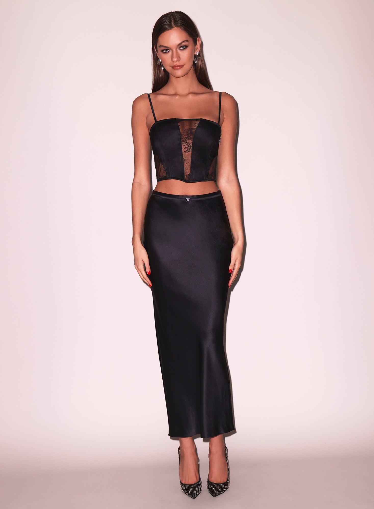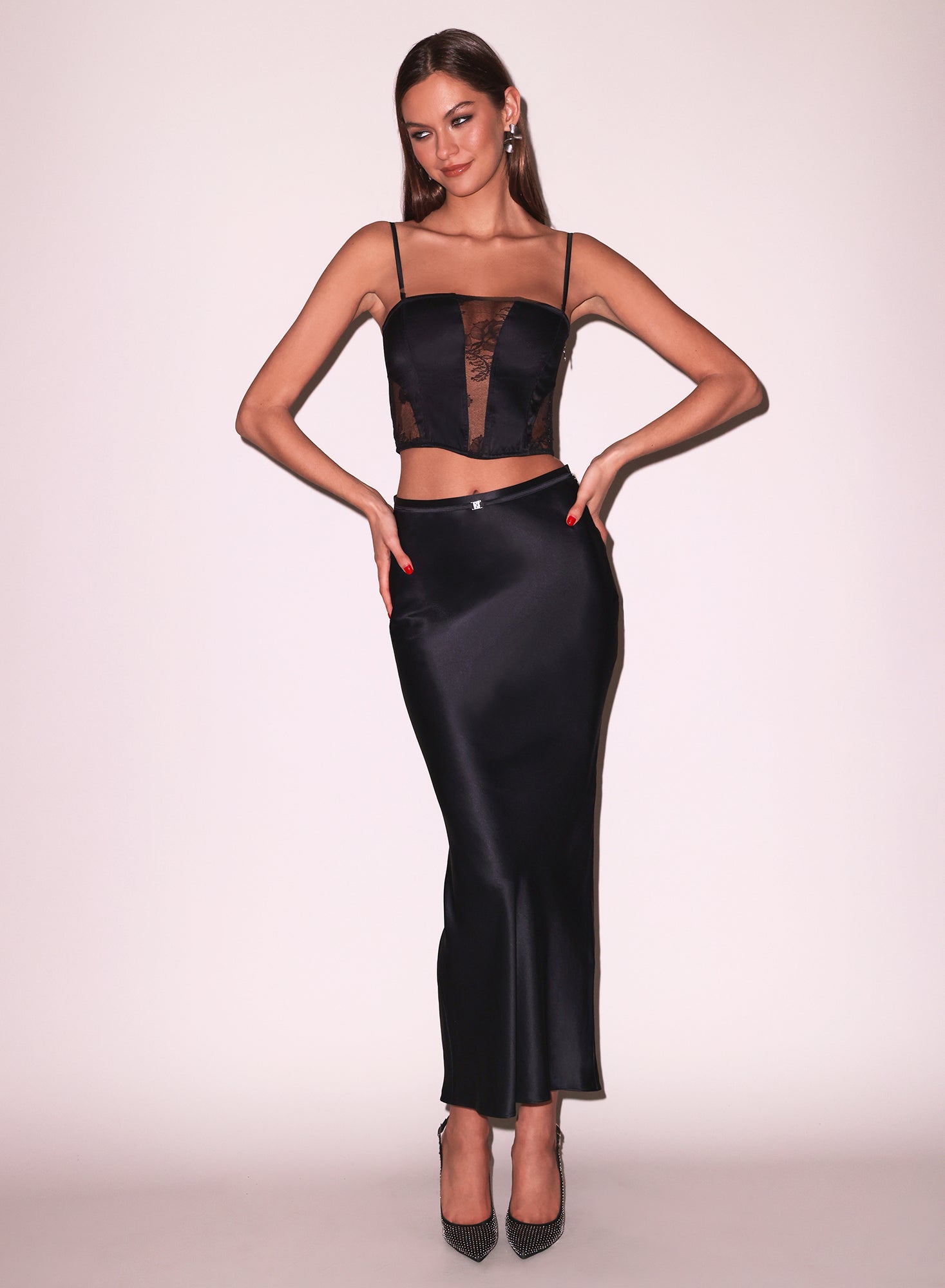 Style it with the matching cheeky and bias skirt for a complete, cohesive look, or pair it with high-waisted trousers or a flowing midi skirt for versatile daytime-to-evening elegance.