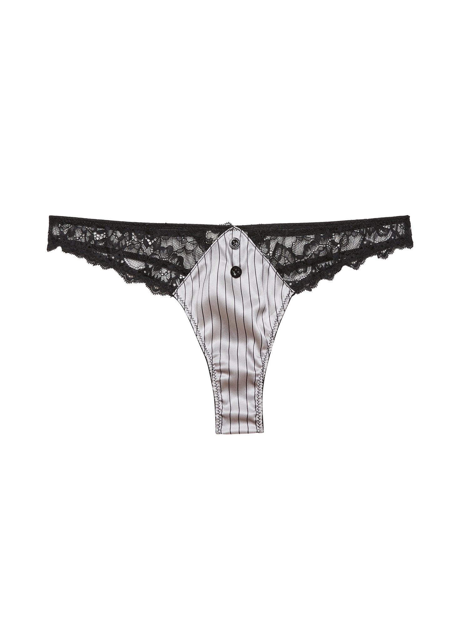 Cut from luxe pinstripe silk with scalloped lace panels and a delicate front button detail, this piece offers a refined and sensual fit.