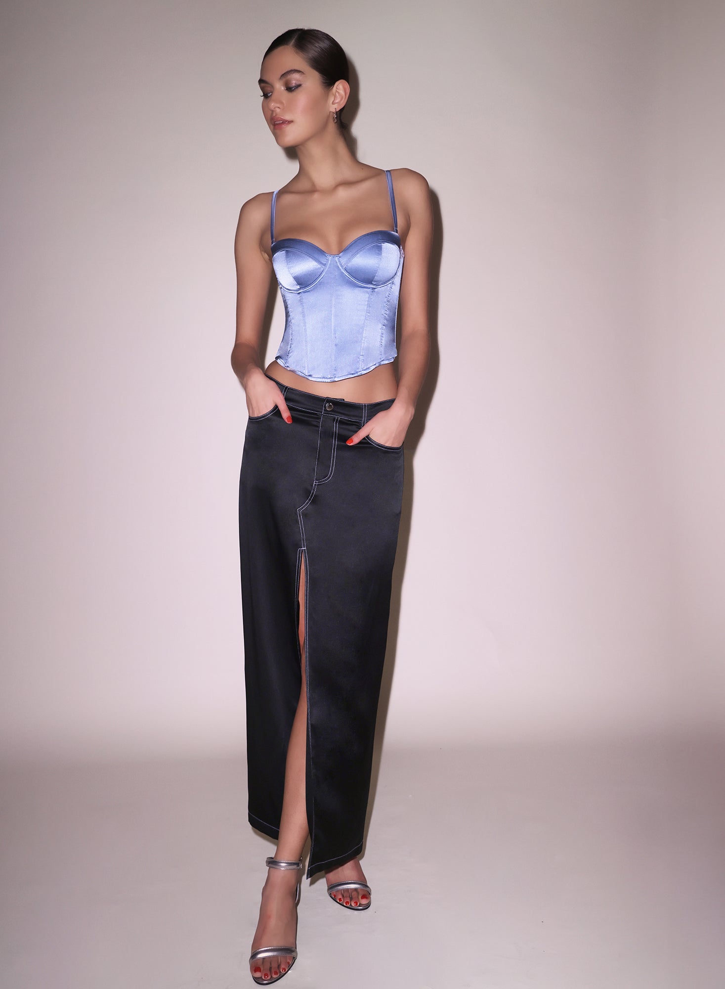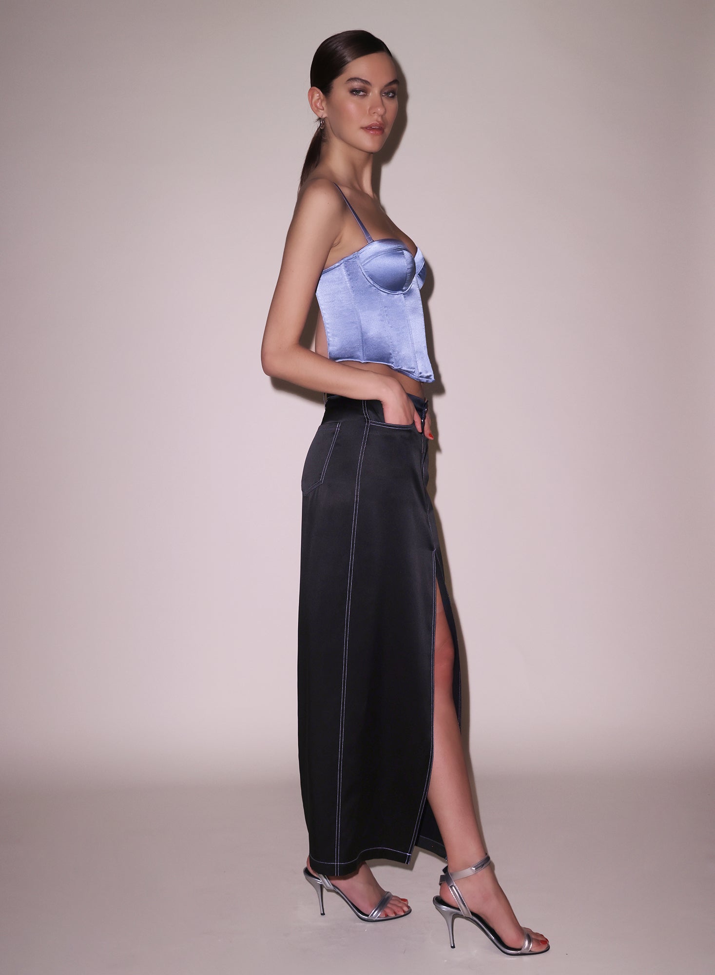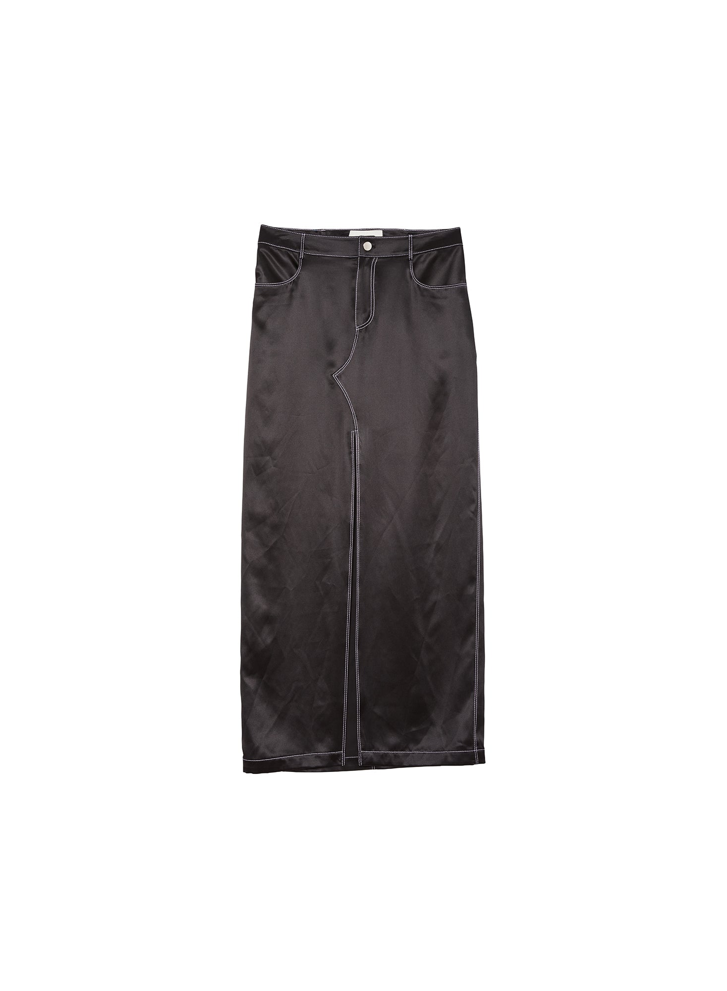 This luxe silk charmeuse skirt features denim-inspired topstitch detailing and functional pockets, with a low-rise fit that sits just below the waist for a relaxed silhouette.