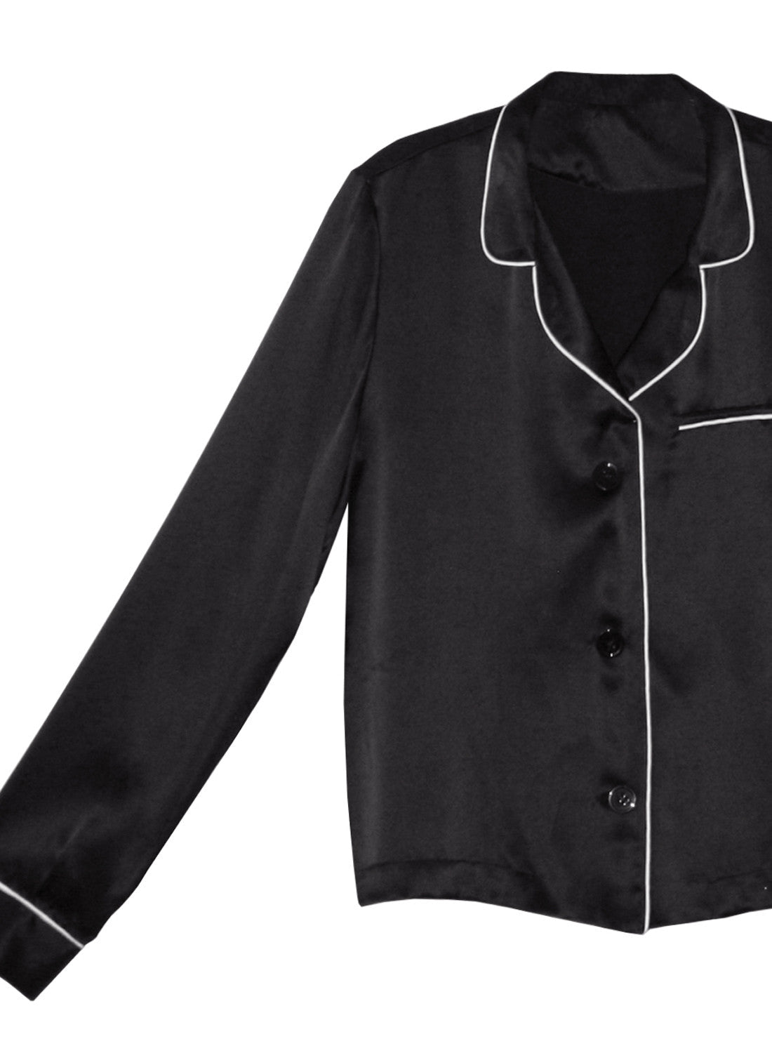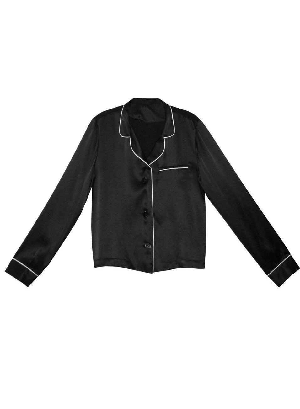 This decadent silk satin top features a classic front button closure, delicate white trim, and a charming pocket detail. Pair it with matching bottoms to create a chic and cohesive bedtime set.