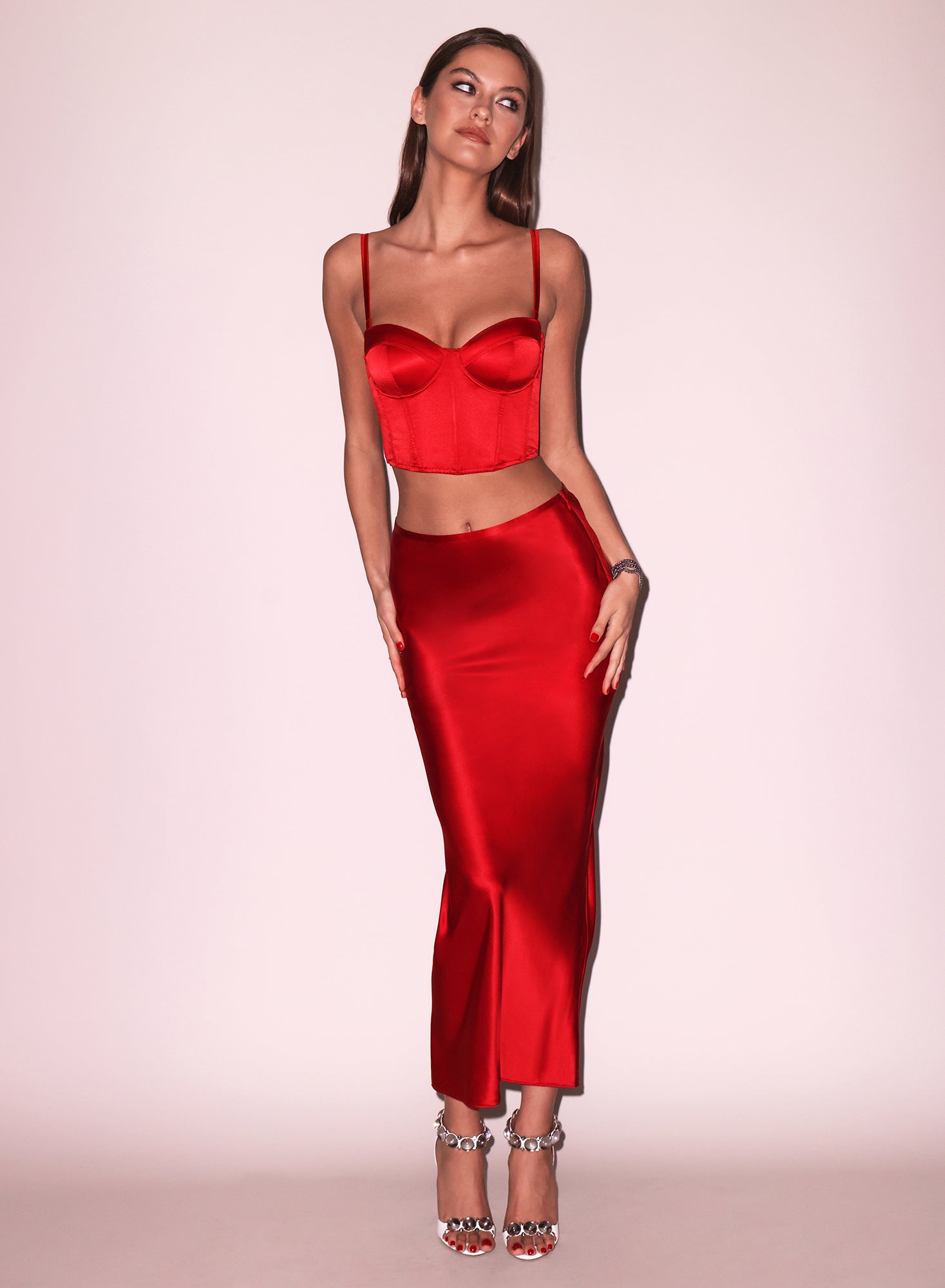 Crafted from bias-cut silk charmeuse that drapes beautifully, featuring a subtle back cutout and a graceful slit for a touch of allure. The invisible side zip ensures a clean, seamless look.