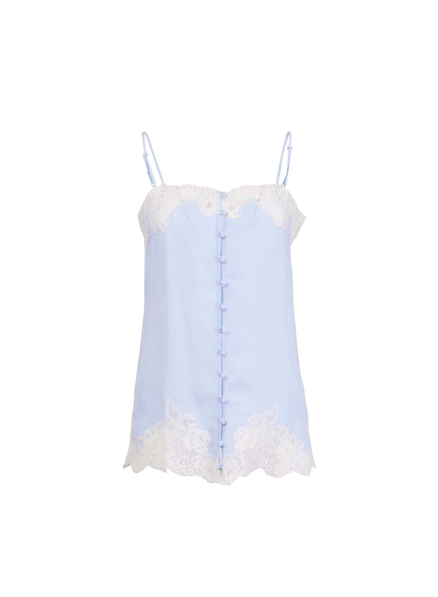 Made from lightweight silk georgette with delicate lace appliqués, featuring functional front buttons and adjustable straps for a personalized fit. Wear it on its own for a simple, elegant look or layer it with a matching lace robe for added texture and coverage.
