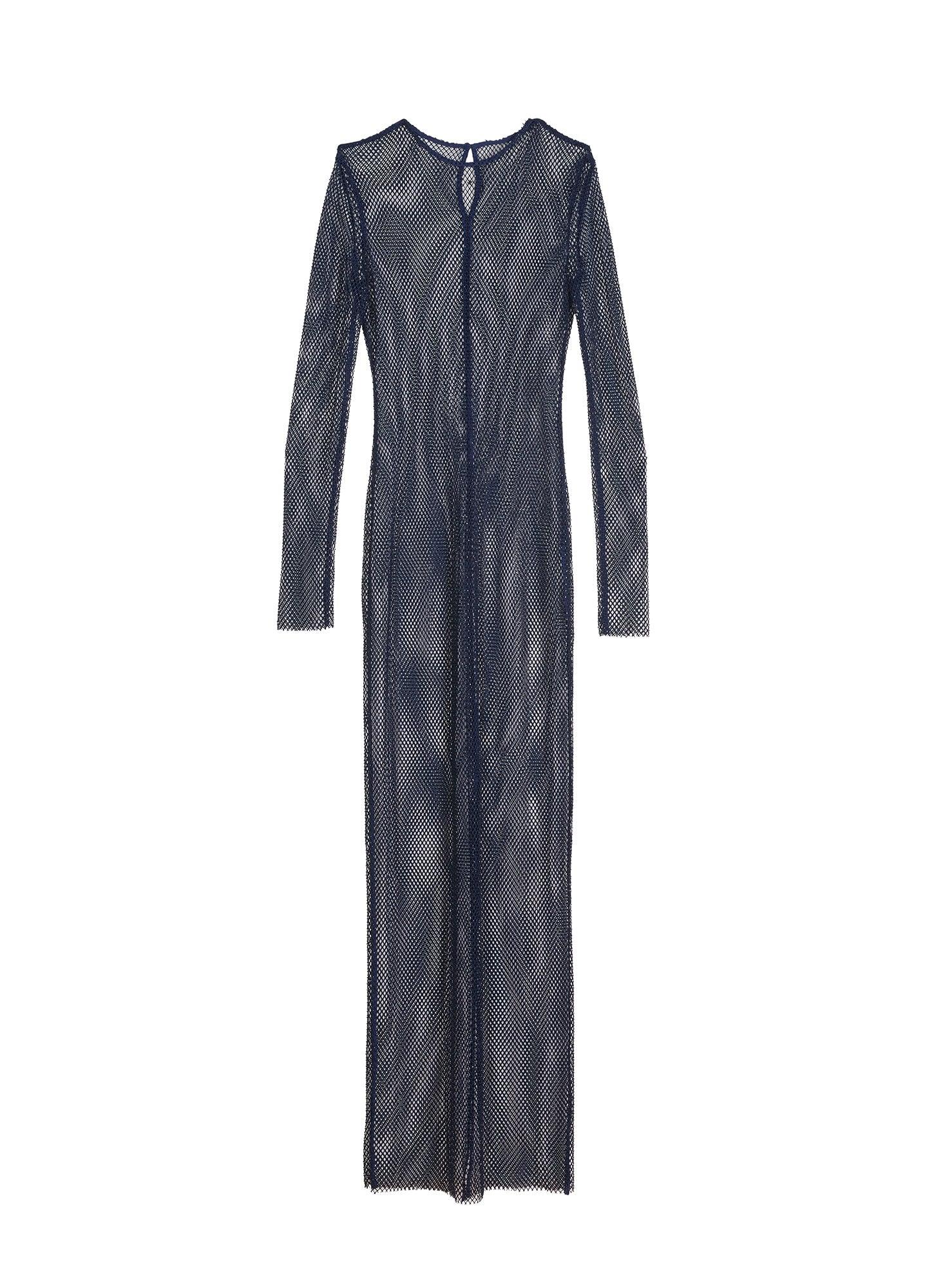 This ultra-glamorous dress features a sexy fishnet fabric that offers a subtle peek at what's underneath, adorned with allover crystal rhinestones that catch and reflect light from every angle. The long sleeves and elegant back keyhole detail add sophistication to the daring silhouette.