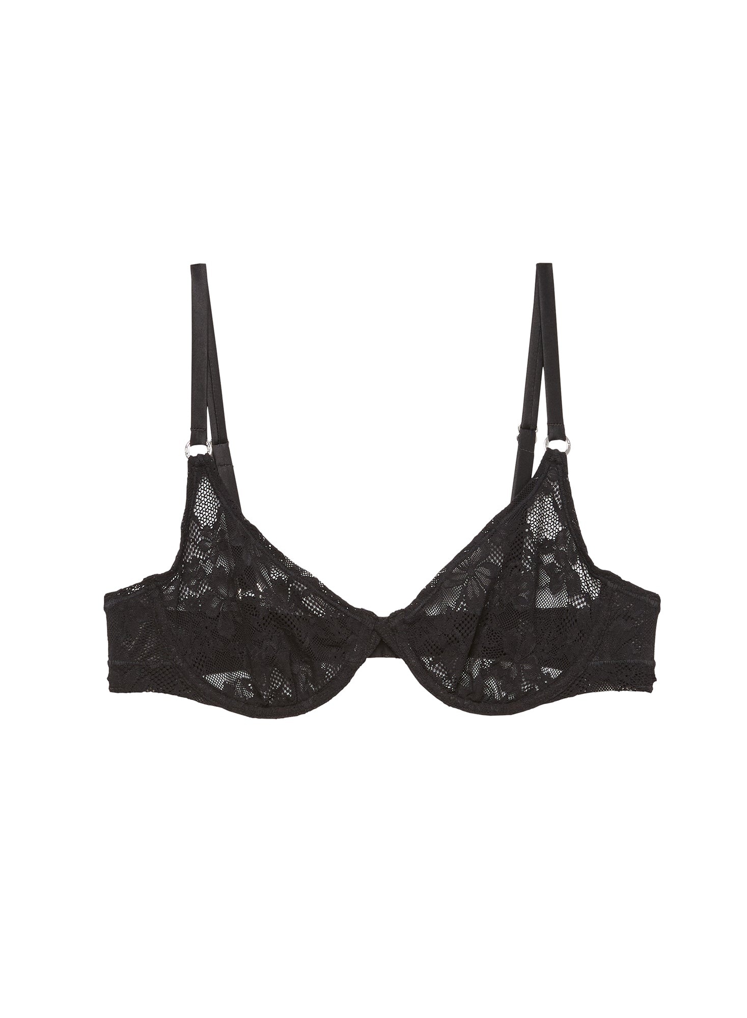 Feels like nothing, gives you everything. This demi bra is cut from ultra comfortable four way stretch lace with underwire cups for a smooth, seamless finish. Features luxe silk adjustable straps with silver o ring detail.