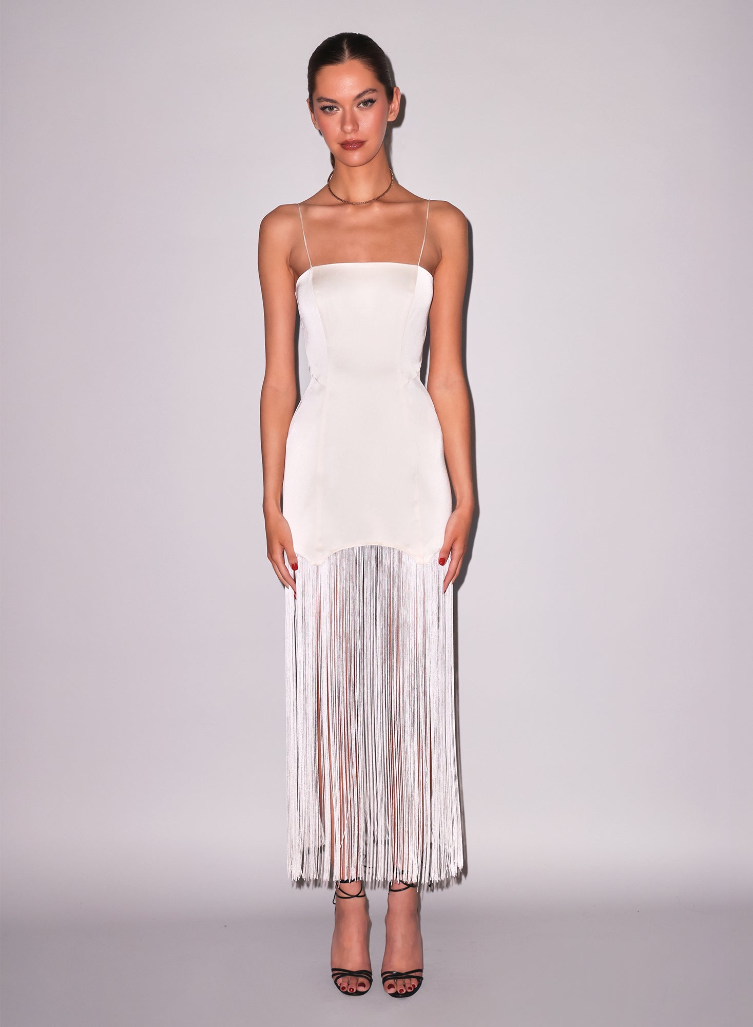 Our dress features a sleek straight neckline and corset-inspired seaming on a satin bodice, flowing into a playful fringe skirt that sways with every step. The adjustable straps and invisible side zip ensure a personalized, secure fit.